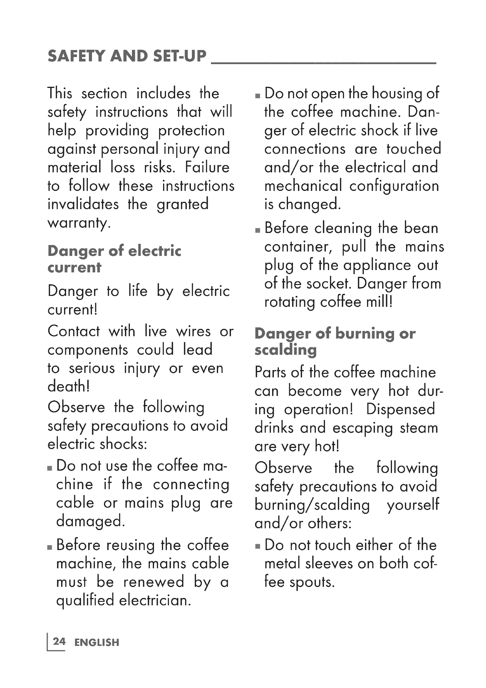 Before cleaning the bean container, pull the mains plug of the appliance out of the socket. Danger from rotating coffee mill! Danger of burning or scalding Parts of the coffee machine can become very hot dur- ing operation! Dispensed drinks and escaping steam are very hot! Observe the following safety precautions to avoid burning/scalding yourself and/or others: