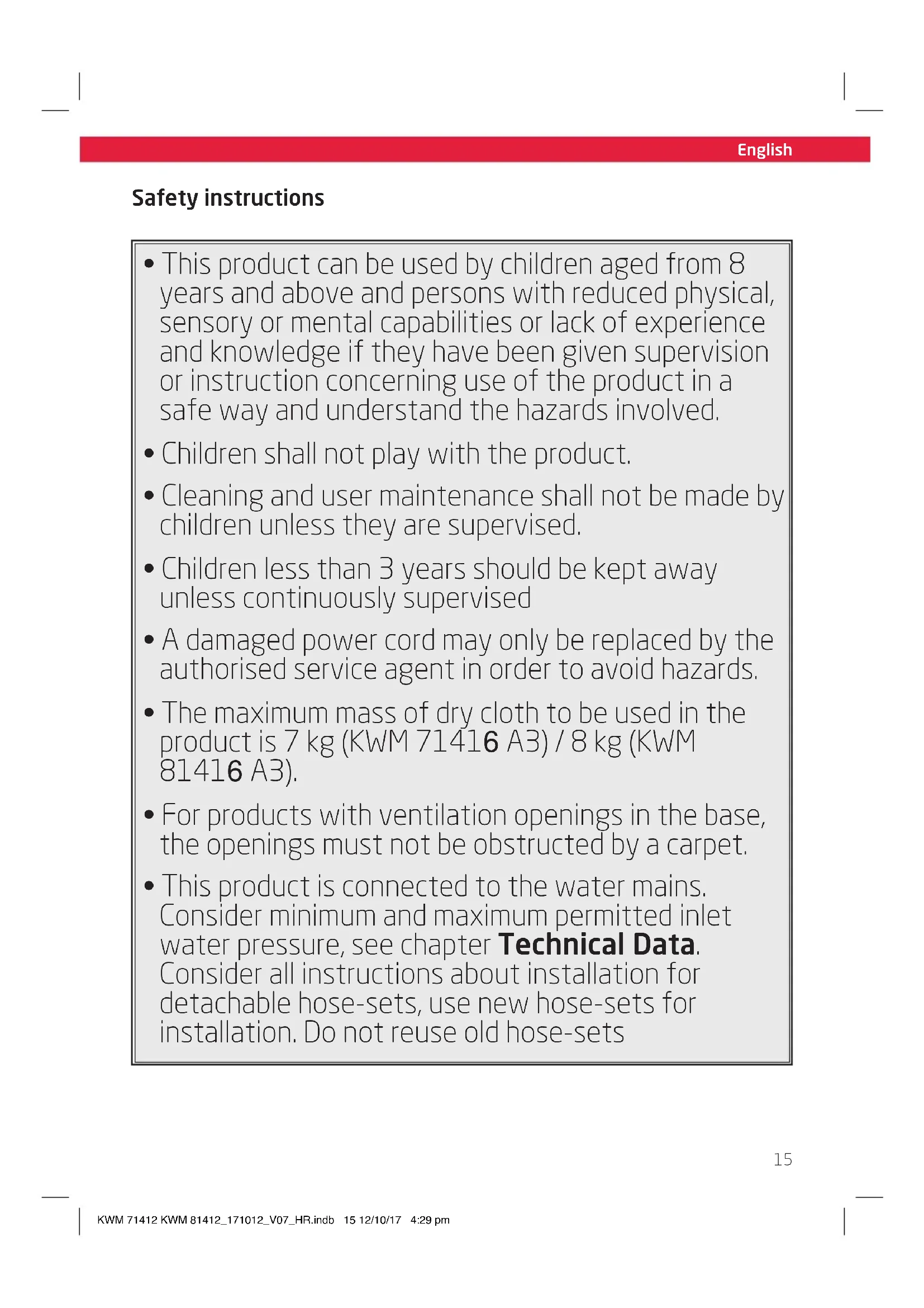 - This product is connected to the water mains. Consider minimum and maximum permitted inlet water pressure, see chapter Technical Data. Consider all instructions about installation for detachable hose-sets, use new hose-sets for installation. Do not reuse old hose-sets KWM 71412 KWM 81412_171012_V07_HR.indb 15 12/10/17 4:29 pmEnglish