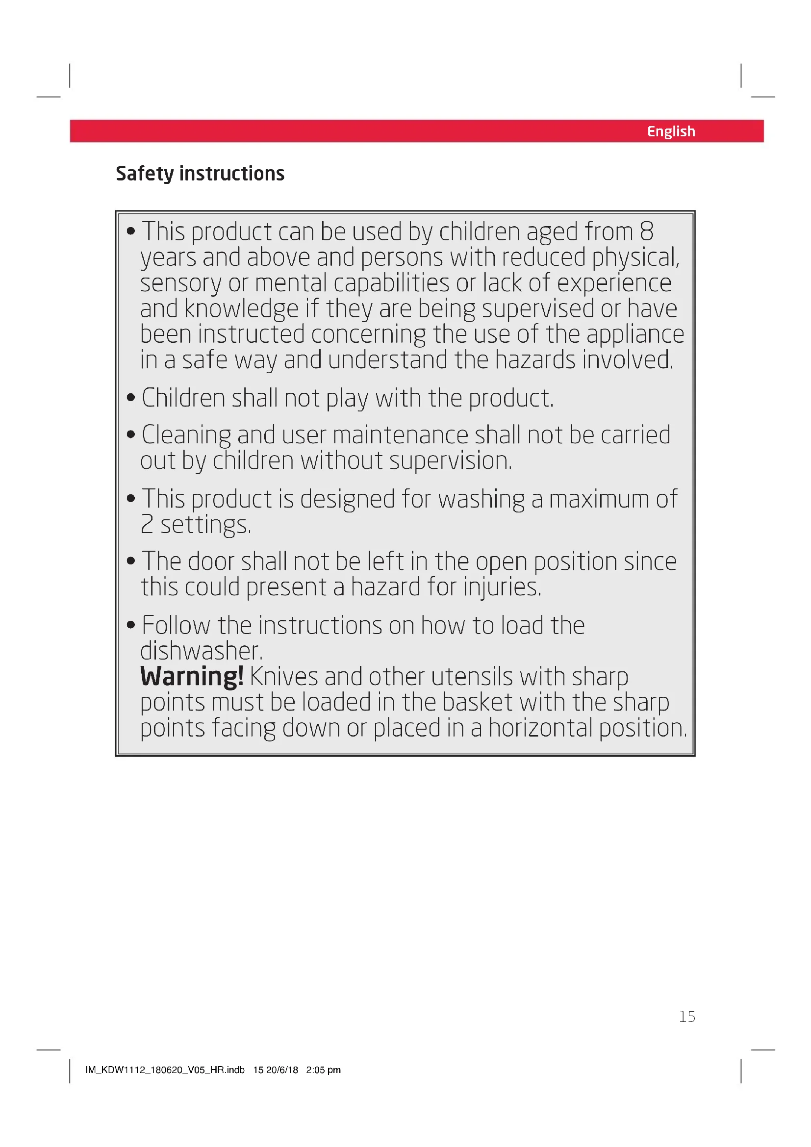 - Follow the instructions on how to load the dishwasher. Warning! Knives and other utensils with sharp points must be loaded in the basket with the sharp points facing down or placed in a horizontal position. IM_KDW1112_180620_V05_HR.indb 15 20/6/18 2:05 pmEnglish