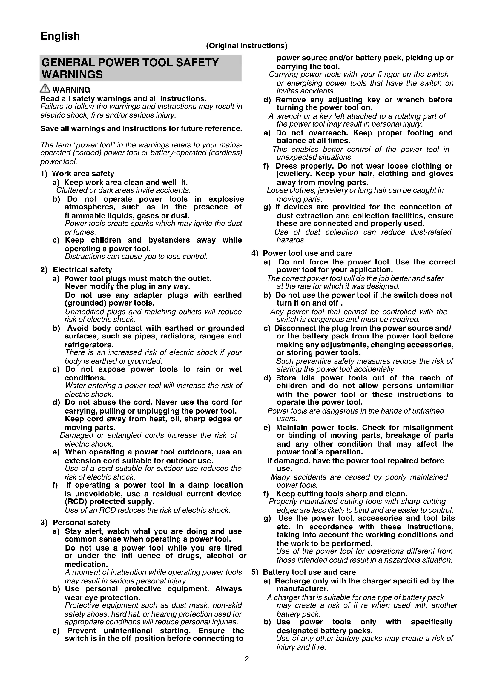 WARNINGS WARNING Read all safety warnings and all instructions. Failure to follow the warnings and instructions may result in electric shock, fi re and/or serious injury. Save all warnings and instructions for future reference. The term “power tool” in the warnings refers to your mains- operated (corded) power tool or battery-operated (cordless) power tool.