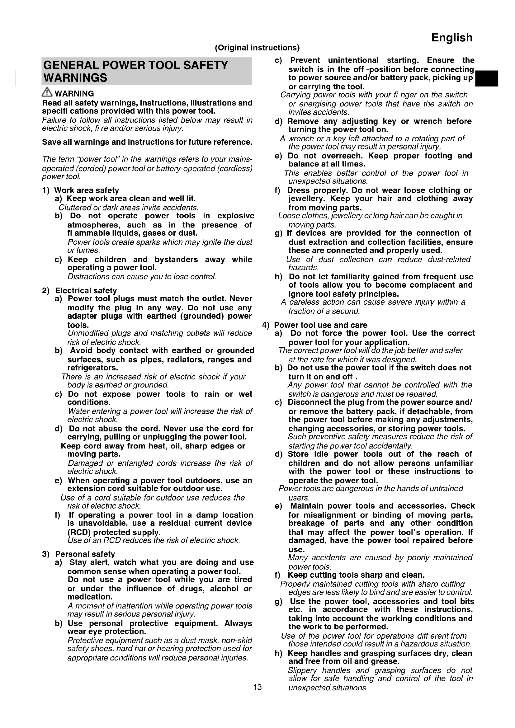 a) Do not force the power tool. Use the correct power tool for your application. The correct power tool will do the job better and safer at the rate for which it was designed. b) Do not use the power tool if the switch does not turn it on and off . Any power tool that cannot be controlled with the switch is dangerous and must be repaired. c) Disconnect the plug from the power source and/ or remove the battery pack, if detachable, from the power tool before making any adjustments, changing accessories, or storing power tools. Such preventive safety measures reduce the risk of starting the power tool accidentally. d) Store idle power tools out of the reach of children and do not allow persons unfamiliar with the power tool or these instructions to operate the power tool. Power tools are dangerous in the hands of untrained users. e) Maintain power tools and accessories. Check for misalignment or binding of moving parts, breakage of parts and any other condition that may aff ect the power toolʼs operation. If damaged, have the power tool repaired before use. Many accidents are caused by poorly maintained power tools. f) Keep cutting tools sharp and clean. Properly maintained cutting tools with sharp cutting edges are less likely to bind and are easier to control. g) Use the power tool, accessories and tool bits etc. in accordance with these instructions, taking into account the working conditions and the work to be performed. Use of the power tool for operations diff erent from those intended could result in a hazardous situation. h) Keep handles and grasping surfaces dry, clean and free from oil and grease. Slippery handles and grasping surfaces do not allow for safe handling and control of the tool in unexpected situations.
