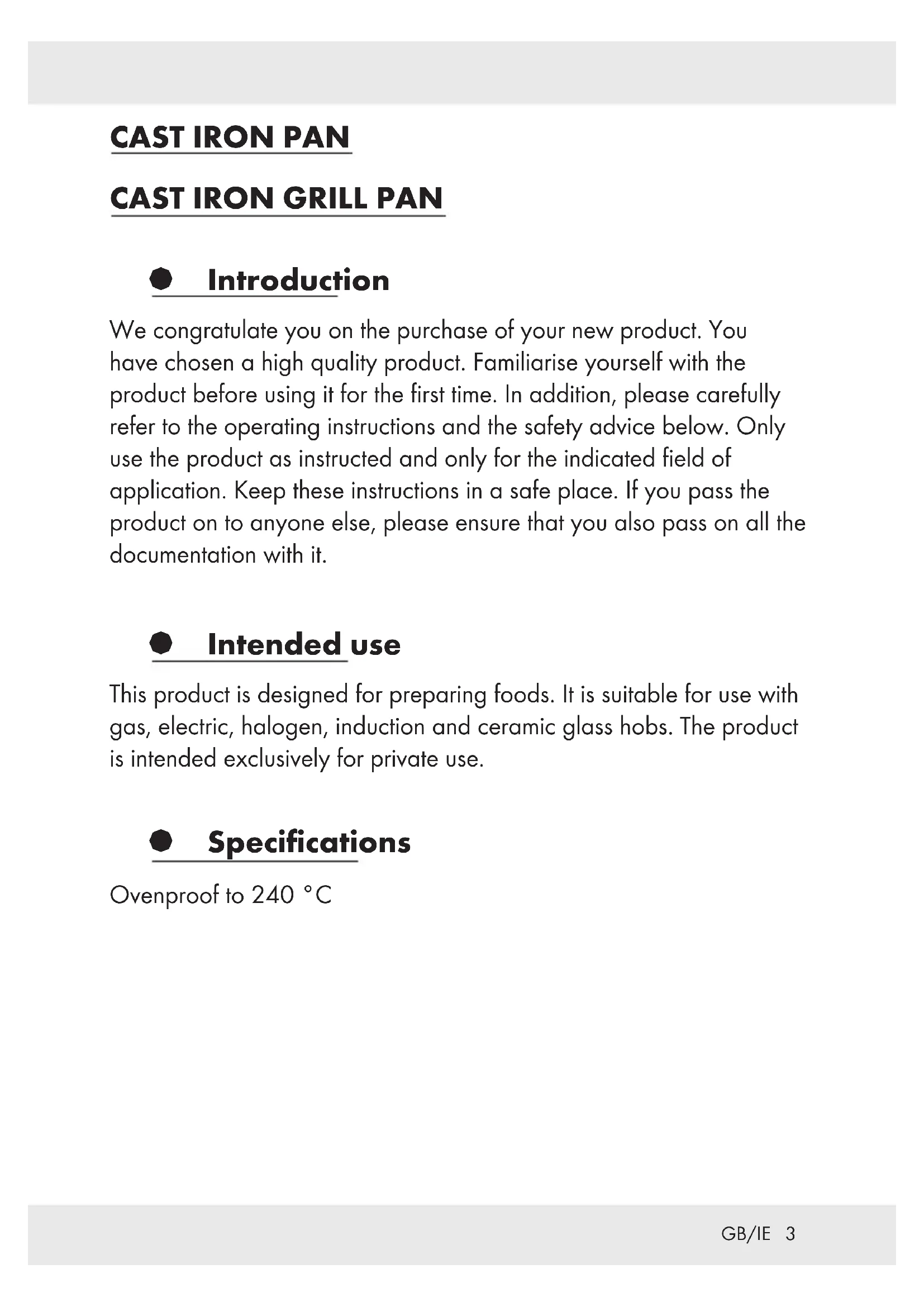 § Introduction We congratulate you on the purchase of your new product. You have chosen a high quality product. Familiarise yourself with the product before using it for the first time. In addition, please carefully refer to the operating instructions and the safety advice below. Only use the product as instructed and only for the indicated field of application. Keep these instructions in a safe place. If you pass the product on to anyone else, please ensure that you also pass on all the documentation with it. § Intended use This product is designed for preparing foods. It is suitable for use with gas, electric, halogen, induction and ceramic glass hobs. The product is intended exclusively for private use. § Specifications Ovenproof to 240 °C4 GB/IE Safety instructions
