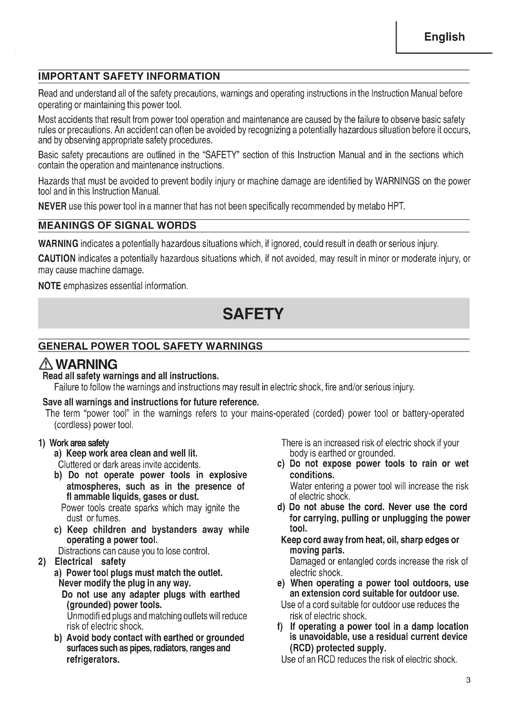 Read and understand all of the safety precautions, warnings and operating instructions in the Instruction Manual before operating or maintaining this power tool. Most accidents that result from power tool operation and maintenance are caused by the failure to observe basic safety rules or precautions. An accident can often be avoided by recognizing a potentially hazardous situation before it occurs, and by observing appropriate safety procedures. Basic safety precautions are outlined in the “SAFETY” section of this Instruction Manual and in the sections which contain the operation and maintenance instructions. Hazards that must be avoided to prevent bodily injury or machine damage are identifi ed by WARNINGS on the power tool and in this Instruction Manual. NEVER use this power tool in a manner that has not been specifi cally recommended by metabo HPT.