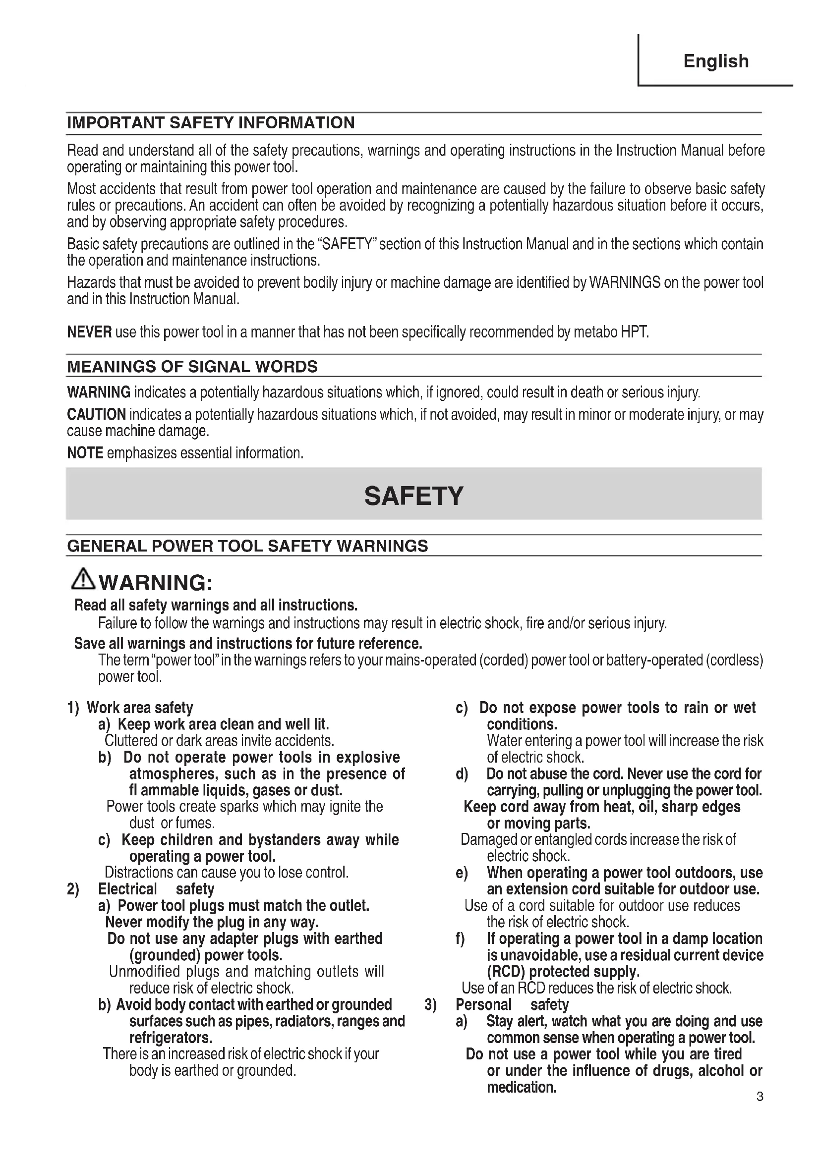 Read and understand all of the safety precautions, warnings and operating instructions in the Instruction Manual before operating or maintaining this power tool. Most accidents that result from power tool operation and maintenance are caused by the failure to observe basic safety rules or precautions. An accident can often be avoided by recognizing a potentially hazardous situation before it occurs, and by observing appropriate safety procedures. Basic safety precautions are outlined in the “SAFETY” section of this Instruction Manual and in the sections which contain the operation and maintenance instructions. Hazards that must be avoided to prevent bodily injury or machine damage are identifi ed by WARNINGS on the power tool and in this Instruction Manual. NEVER use this power tool in a manner that has not been specifi cally recommended by metabo HPT.