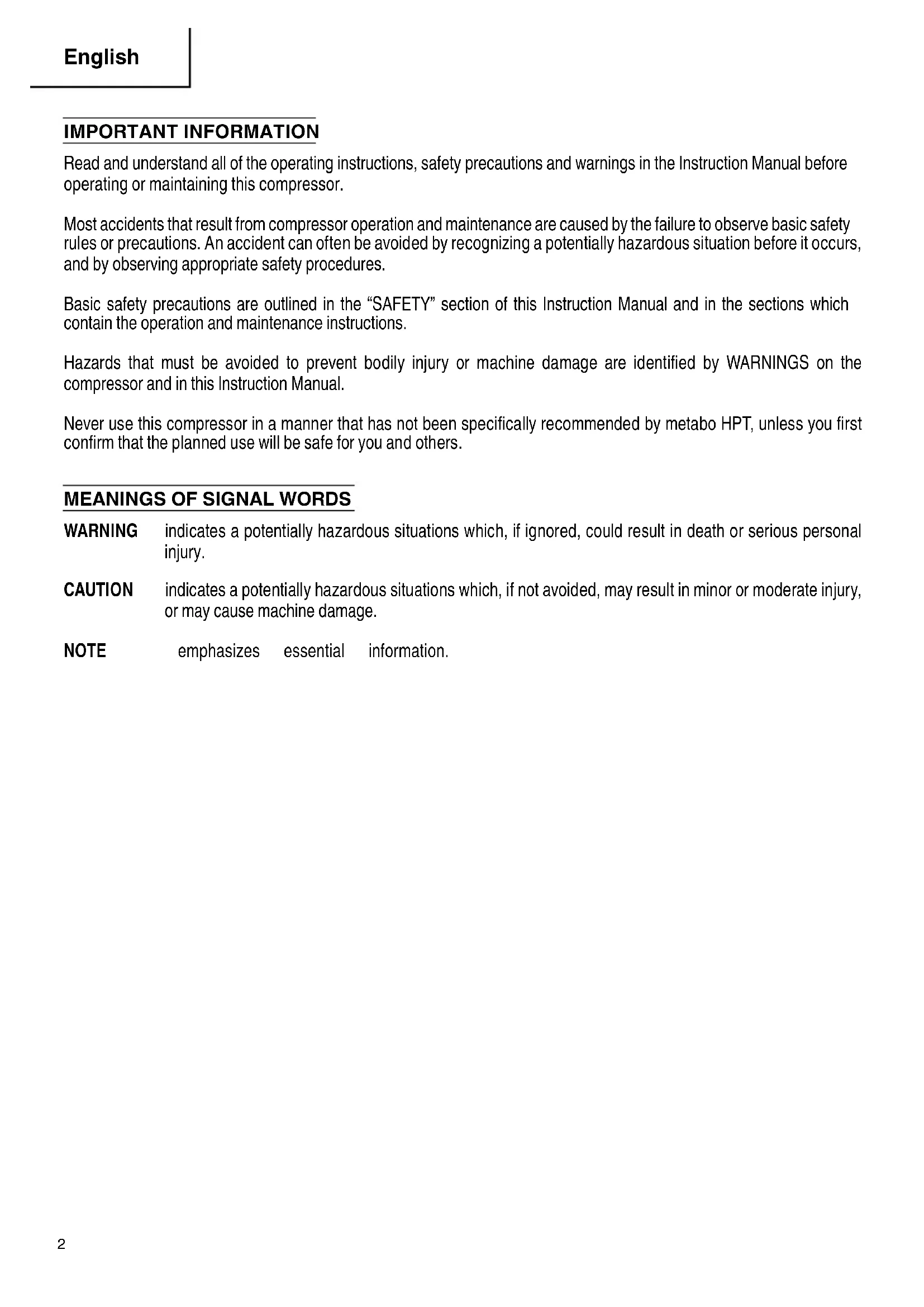 DEFECTIVE OR OPERATING ABNORMALLY. If the compressor appears to be operating unusually, making strange noises or vibration, or otherwise appears defective, stop using it immediately and arrange for repairs by a metabo HPT authorized service center.