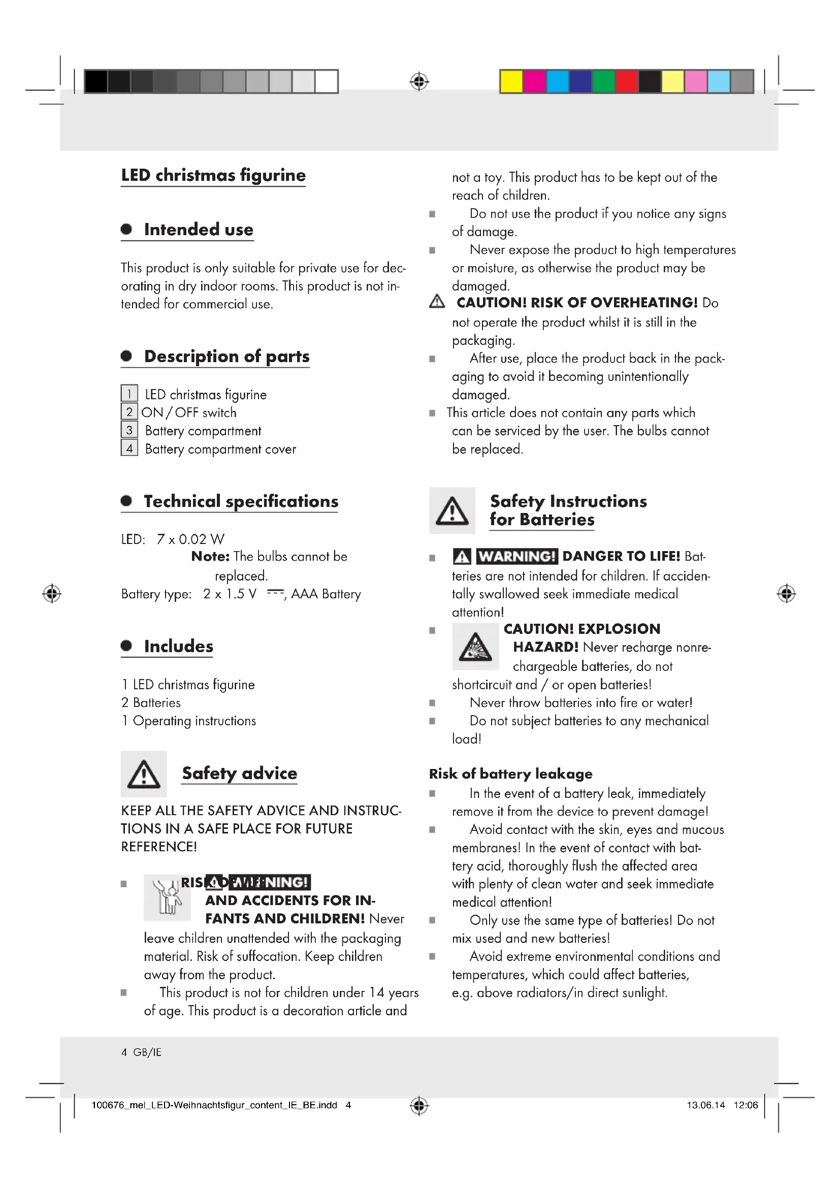 FANTS AND CHILDREN! Never leave children unattended with the packaging material. Risk of suffocation. Keep children away from the product. This product is not for children under 14 years of age. This product is a decoration article and not a toy. This product has to be kept out of the reach of children. Do not use the product if you notice any signs of damage. Never expose the product to high temperatures or moisture, as otherwise the product may be damaged. CAUTION! RISK OF OVERHEATING! Do not operate the product whilst it is still in the packaging. After use, place the product back in the pack- aging to avoid it becoming unintentionally damaged. This article does not contain any parts which can be serviced by the user. The bulbs cannot be replaced. Safety Instructions for Batteries DANGER TO LIFE! Bat- teries are not intended for children. If acciden- tally swallowed seek immediate medical attention! CAUTION! EXPLOSION HAZARD! Never recharge nonre- chargeable batteries, do not shortcircuit and / or open batteries! Never throw batteries into fire or water! Do not subject batteries to any mechanical load! Risk of battery leakage In the event of a battery leak, immediately remove it from the device to prevent damage! Avoid contact with the skin, eyes and mucous membranes! In the event of contact with bat- tery acid, thoroughly flush the affected area with plenty of clean water and seek immediate medical attention! Only use the same type of batteries! Do not mix used and new batteries! Avoid extreme environmental conditions and temperatures, which could affect batteries, e.g. above radiators/in direct sunlight. 100676_mel_LED-Weihnachtsfigur_content_IE_BE.indd 4 13.06.14 12:065 GB/IE Remove the batteries from the device if they have not been used for a long period! Risk of equipment damage Only use the specified battery type! When inserting the battery ensure that it is inserted the right way round! This is shown in the battery compartment! If necessary, clean the battery and device contacts before inserting the battery! Remove dead batteries from the device imme- diately! Before first use Inserting / replacing batteries See fig. B. Switching on and off See fig. B. Cleaning and care Use a feather duster for cleaning purposes. Disposal The packaging is made entirely of recy- clable materials, which you may dispose of at local recycling facilities. Contact your local refuse disposal authority for more details of how to dispose of your worn-out product. To help protect the environment, please dispose of the product properly when it has reached the end of its useful life and not in the household waste. Information on collection points and their opening hours can be obtained from your local authority. Faulty or used batteries must be recycled in accord- ance with Directive 2006 66 / EC. Please return the batteries and / or the device to the available collection points.