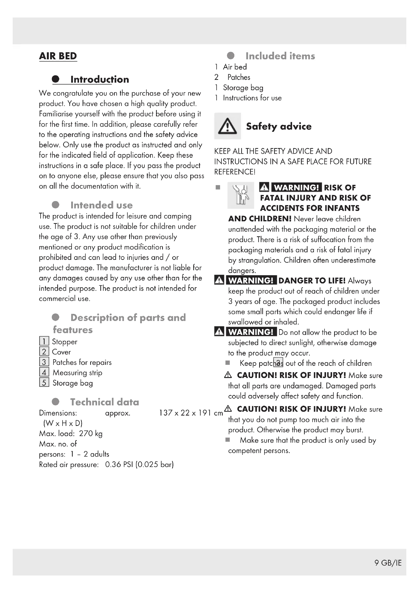 Storage bag Technical data Dimensions: approx. 137 x 22 x 191 cm (W x H x D) Max. load: 270 kg Max. no. of persons: 1 – 2 adults Rated air pressure: 0.36 PSI (0.025 bar) Included items 1 Air bed 2 Patches 1 Storage bag 1 Instructions for use Safety advice