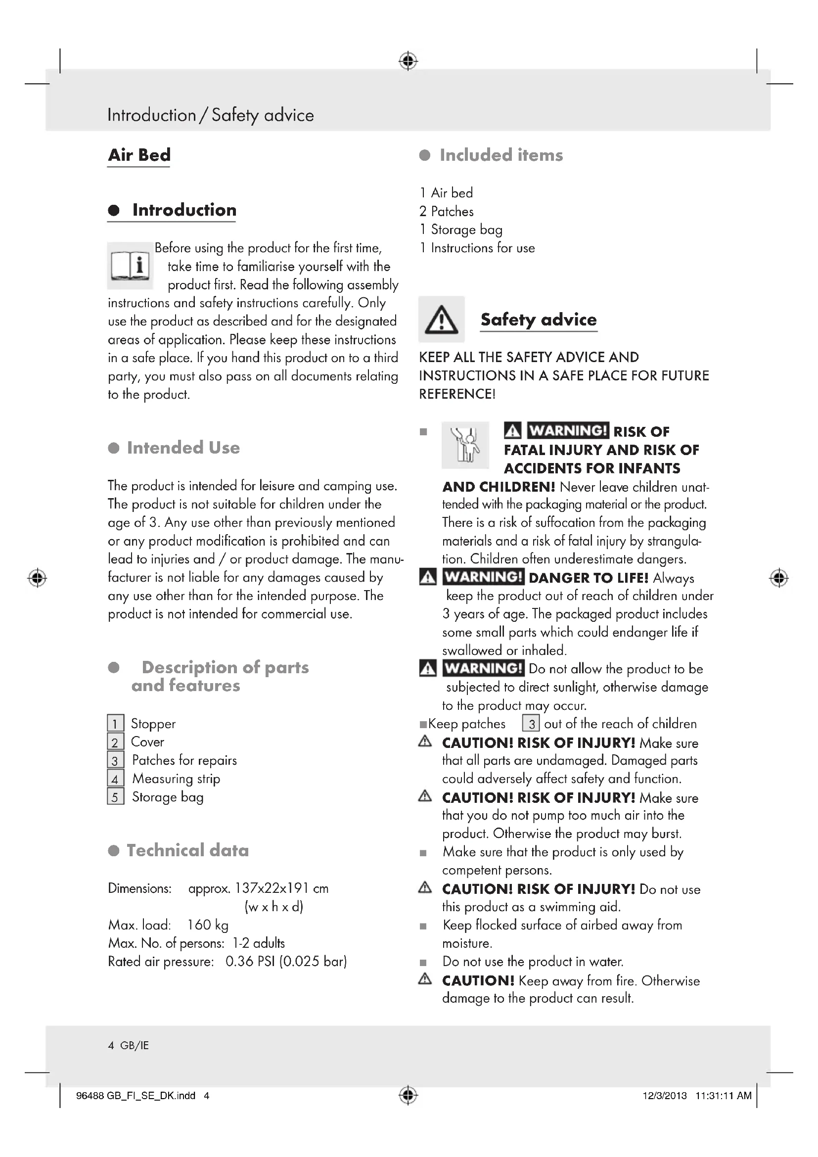 out of the reach of children CAUTION! RISK OF INJURY! Make sure that all parts are undamaged. Damaged parts could adversely affect safety and function. CAUTION! RISK OF INJURY! Make sure that you do not pump too much air into the product. Otherwise the product may burst. J Make sure that the product is only used by competent persons. CAUTION! RISK OF INJURY! Do not use this product as a swimming aid. J Keep flocked surface of airbed away from moisture. J Do not use the product in water. CAUTION! Keep away from fire. Otherwise damage to the product can result. 96488 GB_FI_SE_DK.indd 4 12/3/2013 11:31:11 AM5 GB/IE Safety advice / Operation / Maintenance