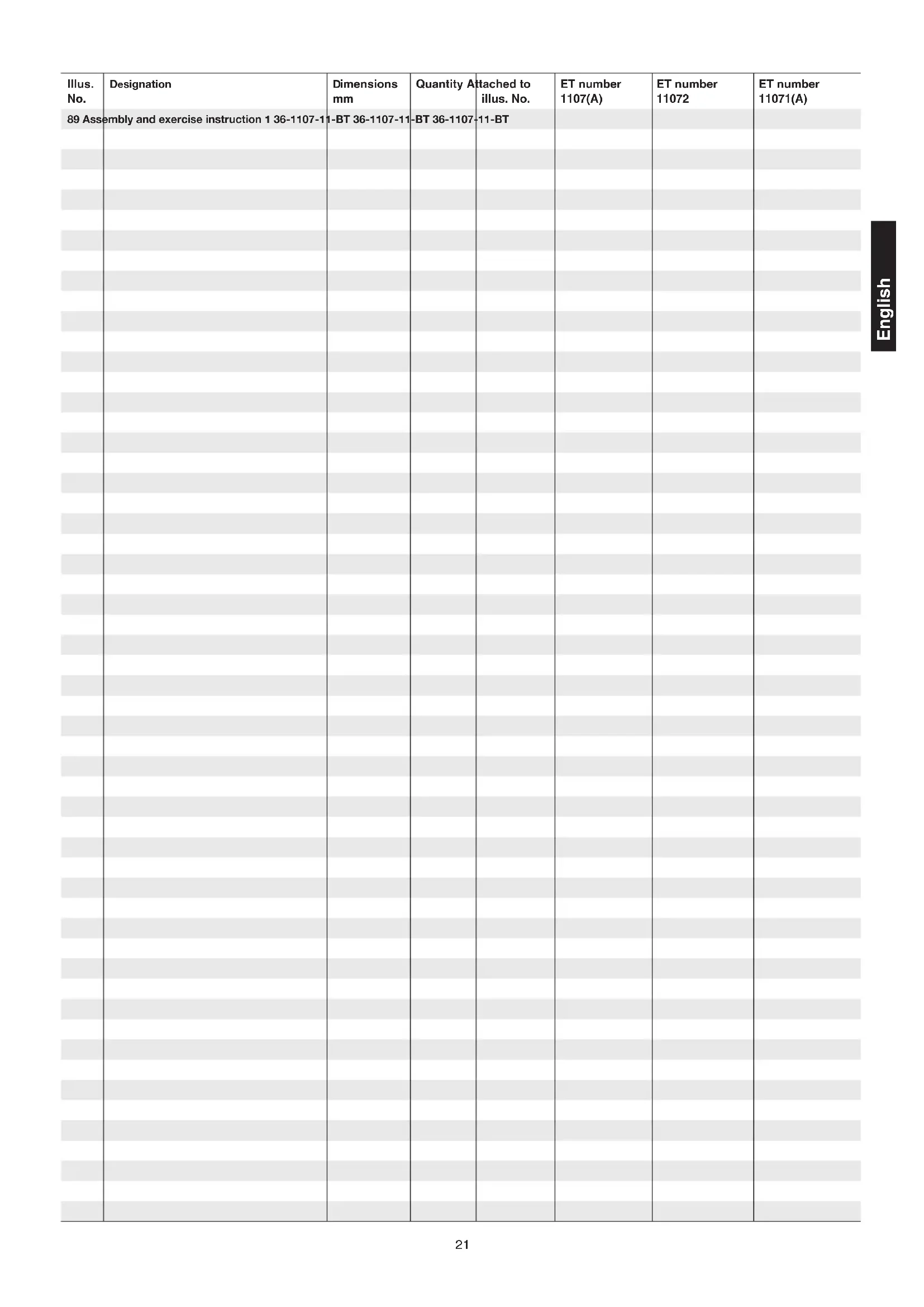 ET number 11071(A) 89 Assembly and exercise instruction 1 36-1107-11-BT 36-1107-11-BT 36-1107-11-BT English22 Assembly Instructions Remove all the separate parts from the packaging, lay them on the floor and check roughly that all are there on the base of the assembly steps. Please note that a number of parts have been connected directly to the main frame and preassembled. In addition, there are several other individual parts that have been attached to separate units. This will make it easier and quicker for you to assemble the equipment. Assembly time: 30 - 40 min. Step 1: Attach the stabilizer (20+27) at main frame (1).