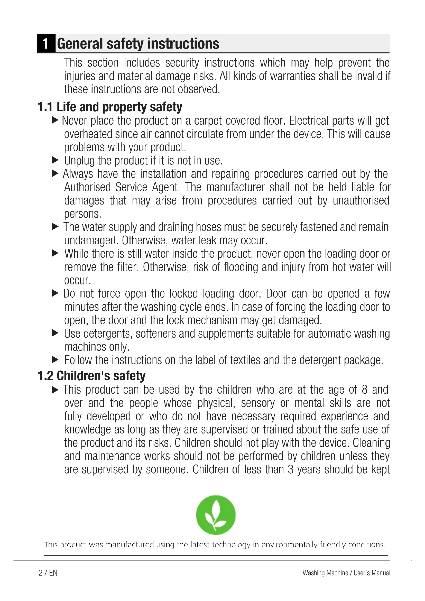 This product can be used by the children who are at the age of 8 and over and the people whose physical, sensory or mental skills are not fully developed or who do not have necessary required experience and knowledge as long as they are supervised or trained about the safe use of the product and its risks. Children should not play with the device. Cleaning and maintenance works should not be performed by children unless they are supervised by someone. Children of less than 3 years should be kept This product was manufactured using the latest technology in environmentally friendly conditions.3 / EN Washing Machine / User’s Manual This product was manufactured using the latest technology in environmentally friendly conditions. away unless continuously supervised.