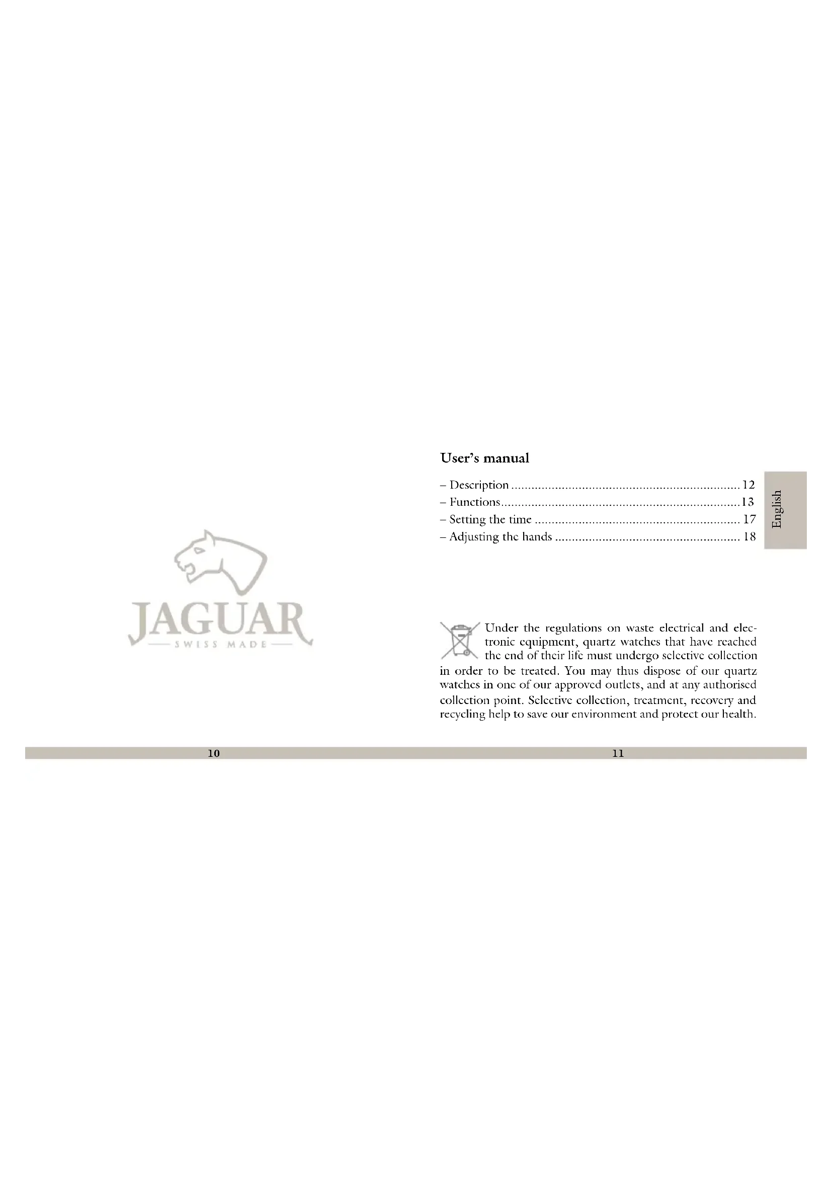 - – Adjusting the hands Under the regulations on waste electrical and elec- tronic equipment, quartz watches that have reached the end of their life must undergo selective collection in order to be treated. You may thus dispose of our quartz watches in one of our approved outlets, and at any authorised collection point. Selective collection, treatment, recovery and recycling help to save our environment and protect our health.12 13 English p. 18