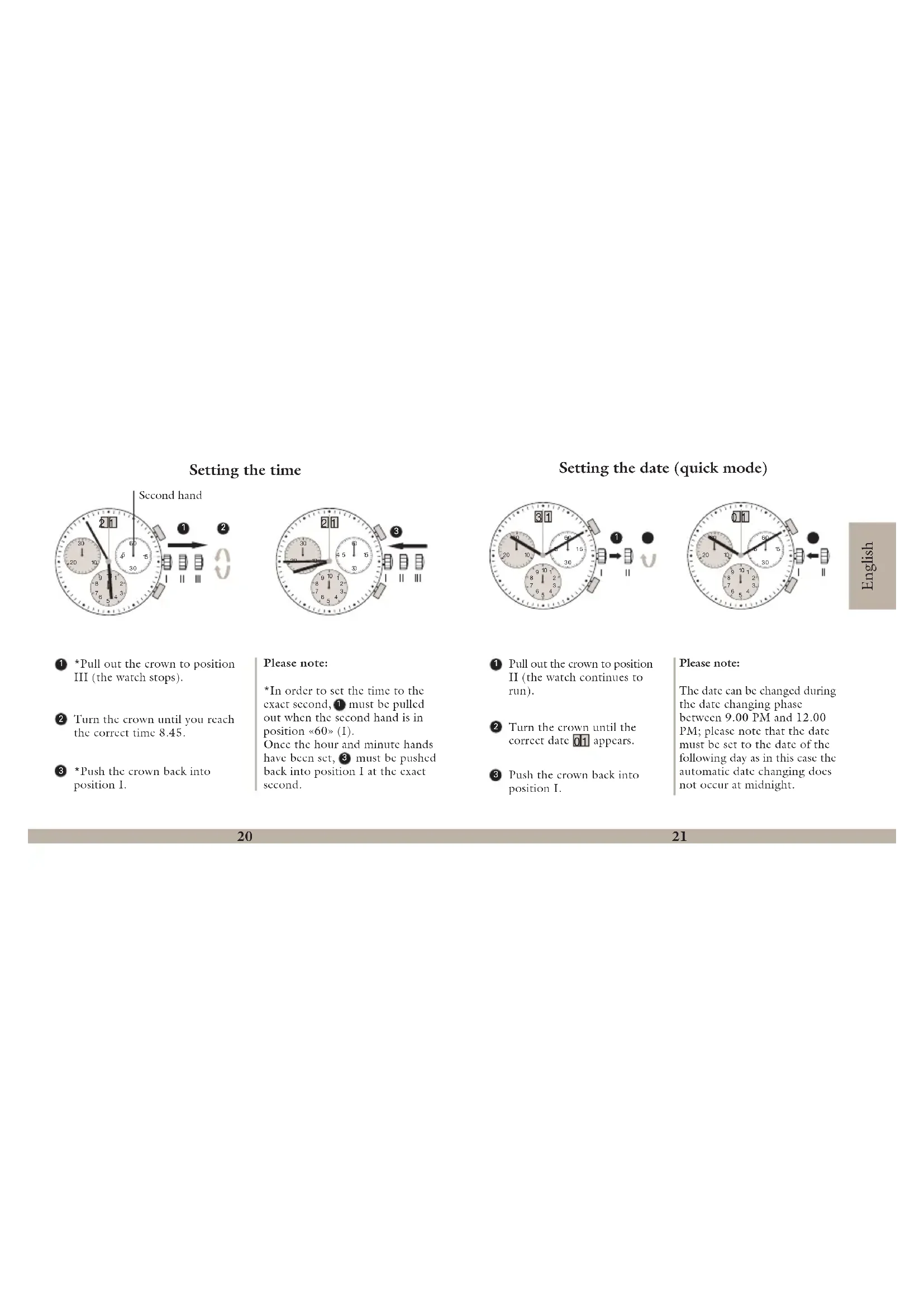 Control buttons English20 Setting the time *Pull out the crown to position III (the watch stops).