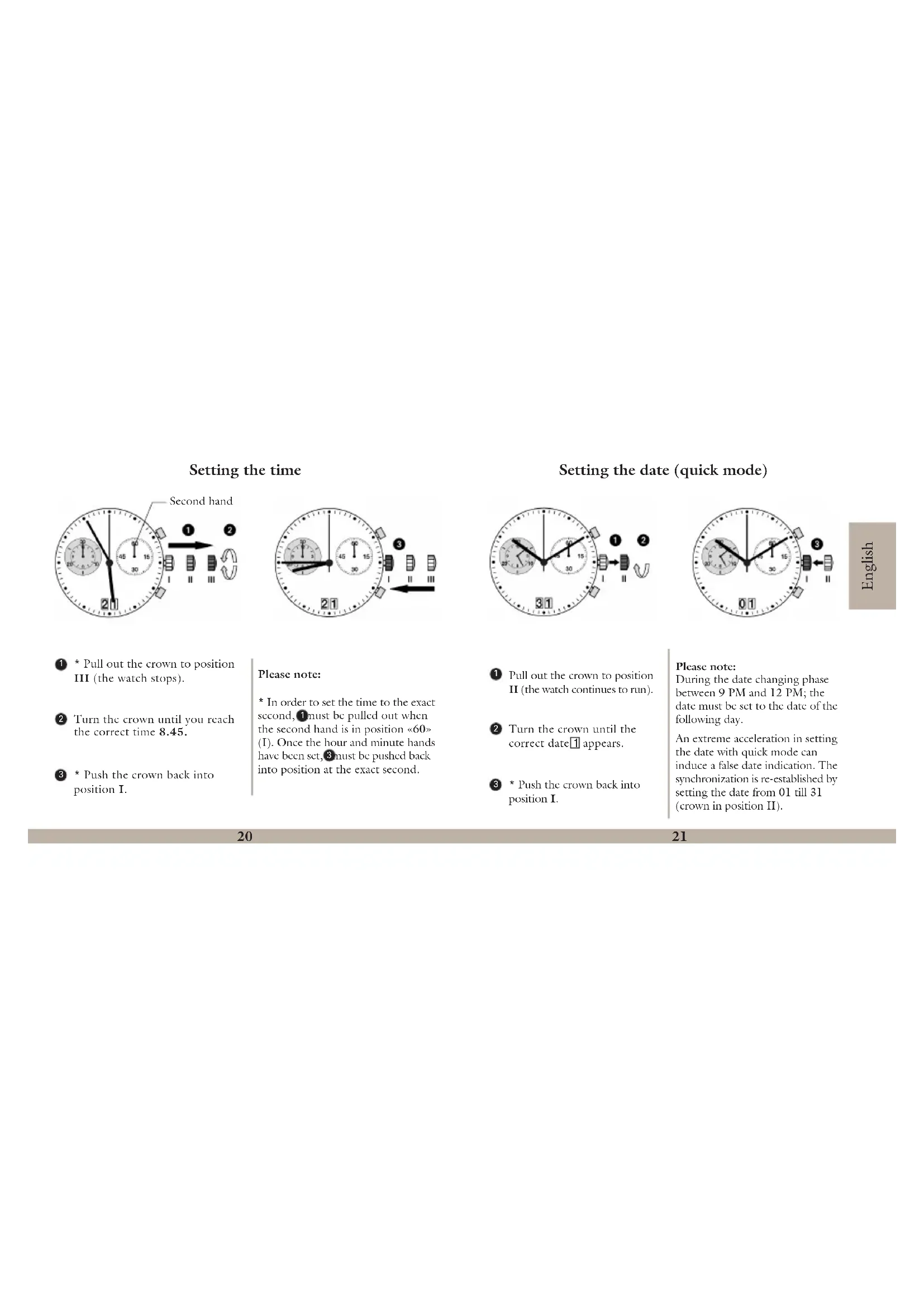 - Push the crown back into position I. Setting the date (quick mode) Pull out the crown to position II (the watch continues to run). Turn the crown until the correct date 1 appears. Please note: During the date changing phase between 9 PM and 12 PM; the date must be set to the date of the following day. An extreme acceleration in setting the date with quick mode can induce a false date indication. The synchronization is re-established by setting the date from 01 till 31 (crown in position II).