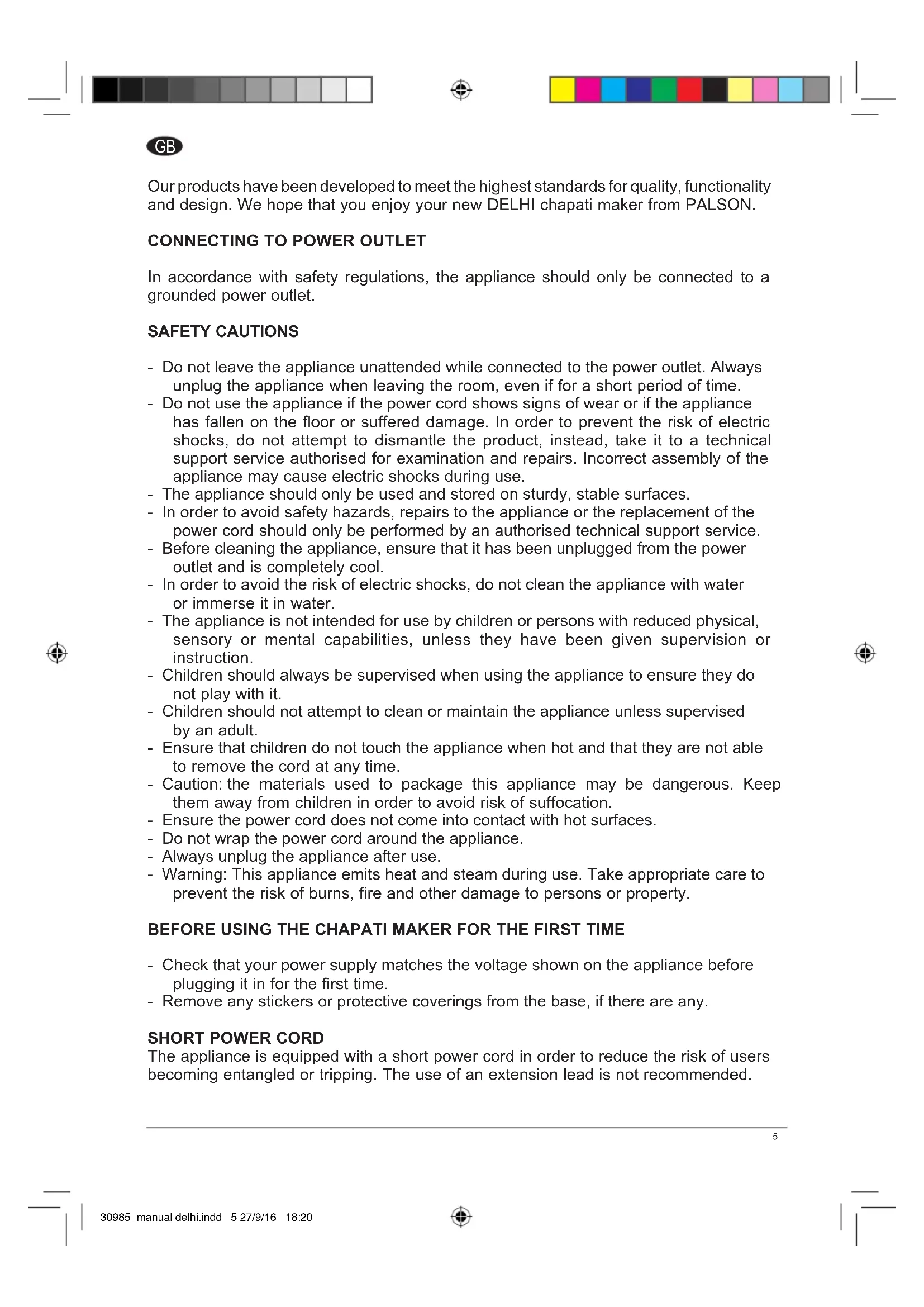 In accordance with safety regulations, the appliance should only be connected to a grounded power outlet. SAFETY CAUTIONS - Do not leave the appliance unattended while connected to the power outlet. Always unplug the appliance when leaving the room, even if for a short period of time. - Do not use the appliance if the power cord shows signs of wear or if the appliance has fallen on the floor or suffered damage. In order to prevent the risk of electric shocks, do not attempt to dismantle the product, instead, take it to a technical support service authorised for examination and repairs. Incorrect assembly of the appliance may cause electric shocks during use. - The appliance should only be used and stored on sturdy, stable surfaces. - In order to avoid safety hazards, repairs to the appliance or the replacement of the power cord should only be performed by an authorised technical support service. - Before cleaning the appliance, ensure that it has been unplugged from the power outlet and is completely cool. - In order to avoid the risk of electric shocks, do not clean the appliance with water or immerse it in water. - The appliance is not intended for use by children or persons with reduced physical, sensory or mental capabilities, unless they have been given supervision or instruction. - Children should always be supervised when using the appliance to ensure they do not play with it. - Children should not attempt to clean or maintain the appliance unless supervised by an adult. - Ensure that children do not touch the appliance when hot and that they are not able to remove the cord at any time. - Caution: the materials used to package this appliance may be dangerous. Keep them away from children in order to avoid risk of suffocation. - Ensure the power cord does not come into contact with hot surfaces. - Do not wrap the power cord around the appliance. - Always unplug the appliance after use. - Warning: This appliance emits heat and steam during use. Take appropriate care to prevent the risk of burns, fire and other damage to persons or property. BEFORE USING THE CHAPATI MAKER FOR THE FIRST TIME - Check that your power supply matches the voltage shown on the appliance before plugging it in for the first time. - Remove any stickers or protective coverings from the base, if there are any.