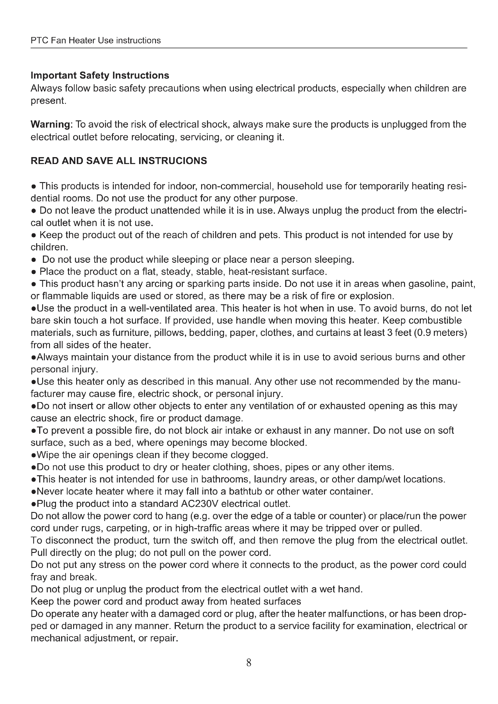 ● This products is intended for indoor, non-commercial, household use for temporarily heating resi- dential rooms. Do not use the product for any other purpose. ● Do not leave the product unattended while it is in use. Always unplug the product from the electri- cal outlet when it is not use. ● Keep the product out of the reach of children and pets. This product is not intended for use by children. ● Do not use the product while sleeping or place near a person sleeping. ● Place the product on a at, steady, stable, heat-resistant surface. ● This product hasn’t any arcing or sparking parts inside. Do not use it in areas when gasoline, paint, or ammable liquids are used or stored, as there may be a risk of re or explosion. ●Use the product in a well-ventilated area. This heater is hot when in use. To avoid burns, do not let bare skin touch a hot surface. If provided, use handle when moving this heater. Keep combustible materials, such as furniture, pillows, bedding, paper, clothes, and curtains at least 3 feet (0.9 meters) from all sides of the heater. ●Always maintain your distance from the product while it is in use to avoid serious burns and other personal injury. ●Use this heater only as described in this manual. Any other use not recommended by the manu- facturer may cause re, electric shock, or personal injury. ●Do not insert or allow other objects to enter any ventilation of or exhausted opening as this may cause an electric shock, re or product damage. ●To prevent a possible re, do not block air intake or exhaust in any manner. Do not use on soft surface, such as a bed, where openings may become blocked. ●Wipe the air openings clean if they become clogged. ●Do not use this product to dry or heater clothing, shoes, pipes or any other items. ●This heater is not intended for use in bathrooms, laundry areas, or other damp/wet locations. ●Never locate heater where it may fall into a bathtub or other water container. ●Plug the product into a standard AC230V electrical outlet. Do not allow the power cord to hang (e.g. over the edge of a table or counter) or place/run the power cord under rugs, carpeting, or in high-trafc areas where it may be tripped over or pulled. To disconnect the product, turn the switch off, and then remove the plug from the electrical outlet. Pull directly on the plug; do not pull on the power cord. Do not put any stress on the power cord where it connects to the product, as the power cord could fray and break. Do not plug or unplug the product from the electrical outlet with a wet hand. Keep the power cord and product away from heated surfaces Do operate any heater with a damaged cord or plug, after the heater malfunctions, or has been drop- ped or damaged in any manner. Return the product to a service facility for examination, electrical or mechanical adjustment, or repair.ENGLISH PTC Fan Heater Use instructions