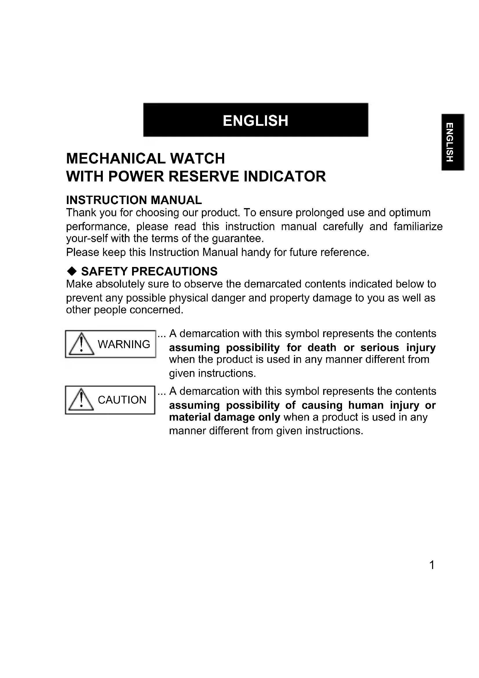 - It is recommended that you use the watch correctly following the above-mentioned scope of usage after ascertaining water resistance precautions marked on the dial or caseback.3 ENGLISH 1 A watch with water resistance for daily life 30m (3 bar) can be used during face-washing, etc. but cannot be used in an environment in which it will be submerged in water. 2 A watch with reinforced water resistance for daily life I 50m (5 bar) can be used while swimming, etc. but cannot be used during any type of diving including skin diving. 3 A watch with reinforced water resistance for daily life II 100m or 200m (10 or 20 bar) can be used while skin diving, but cannot be used while scuba diving using oxygen tanks or saturation diving using helium gas, etc. 4 Keep the crown pushed in at all times (in the normal position) while using the watch. If the crown is the screwed-down type, check that it is securely screwed down. 5 Do not operate the crown underwater, or while the watch is wet. Water may enter the interior of the watch and defeat the water resistance. 6 If your watch is non-water resistant, beware of splashes of water (during face washing, rain, etc.) and sweat. If the watch becomes wet from water or sweat, wipe the moisture off with a dry, soft cloth. 7 Even with a water resistant watch for everyday use, avoid directing strong jets of mains water onto the watch. Water pressure above the limit can apply, which may defeat the water resistance. 8 With a water resistant watch for everyday use, rinse sea water off the case after exposure, then wipe it thoroughly to avoid corrosion and other effects. 9 The interior of the watch contains some amount of moisture, which may cause fogging on the inside of the glass when the outside air is cooler than the internal temperature of the watch. If the fogging is temporary it causes no harm inside the watch, but if prolonged, or if water enters the watch, consult your place of purchase and do not leave the problem untreated. CAUTION
