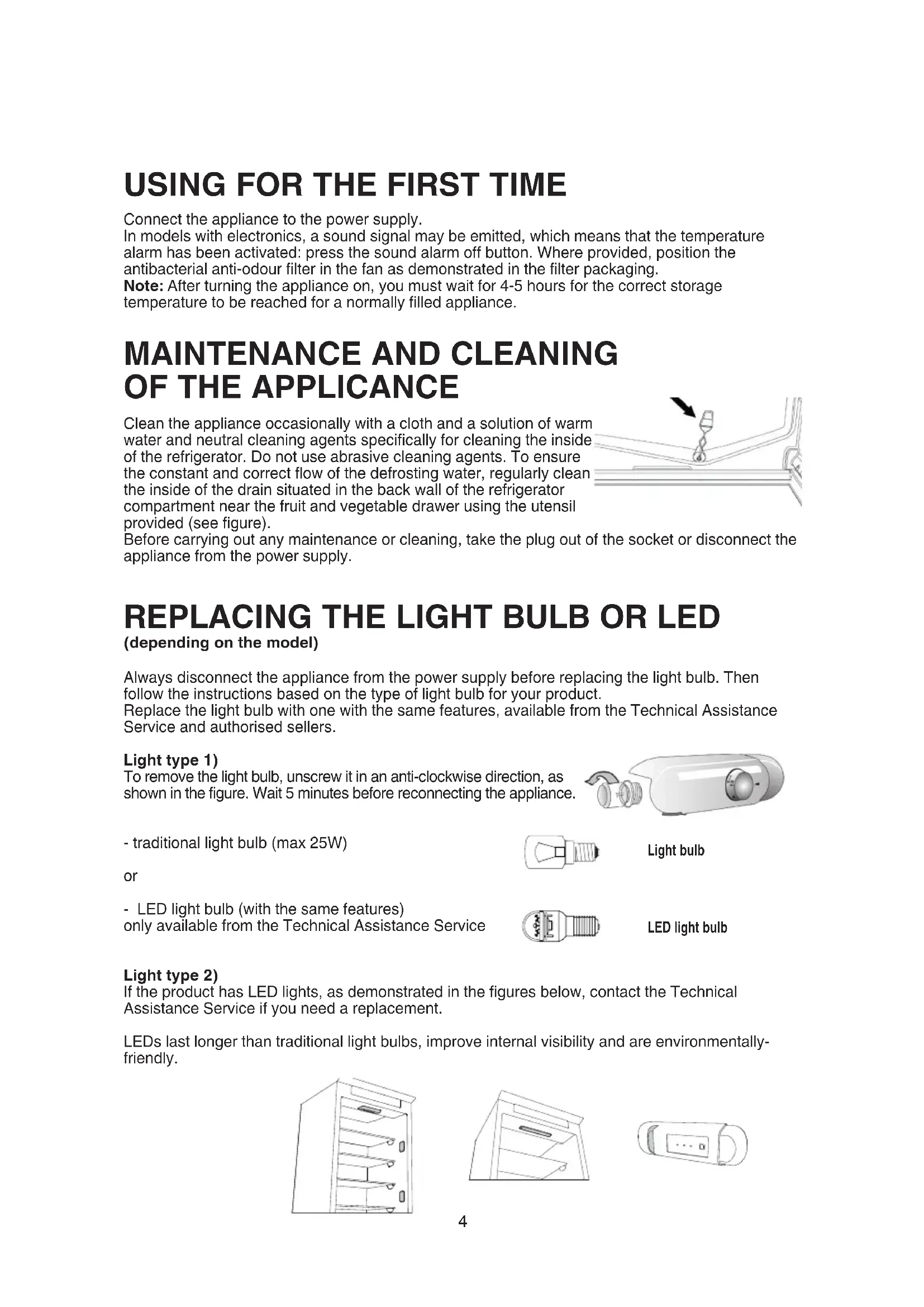 - LED light bulb (with the same features) only available from the Technical Assistance Service Light type 2) If the product has LED lights, as demonstrated in the figures below, contact the Technical Assistance Service if you need a replacement. LEDs last longer than traditional light bulbs, improve internal visibility and are environmentally- friendly. Clean the appliance occasionally with a cloth and a solution of warm water and neutral cleaning agents specifically for cleaning the inside of the refrigerator. Do not use abrasive cleaning agents. To ensure the constant and correct flow of the defrosting water, regularly clean the inside of the drain situated in the back wall of the refrigerator compartment near the fruit and vegetable drawer using the utensil provided (see figure). Before carrying out any maintenance or cleaning, take the plug out of the socket or disconnect the appliance from the power supply. Connect the appliance to the power supply. In models with electronics, a sound signal may be emitted, which means that the temperature alarm has been activated: press the sound alarm off button. Where provided, position the antibacterial anti-odour filter in the fan as demonstrated in the filter packaging. Note: After turning the appliance on, you must wait for 4-5 hours for the correct storage temperature to be reached for a normally filled appliance.