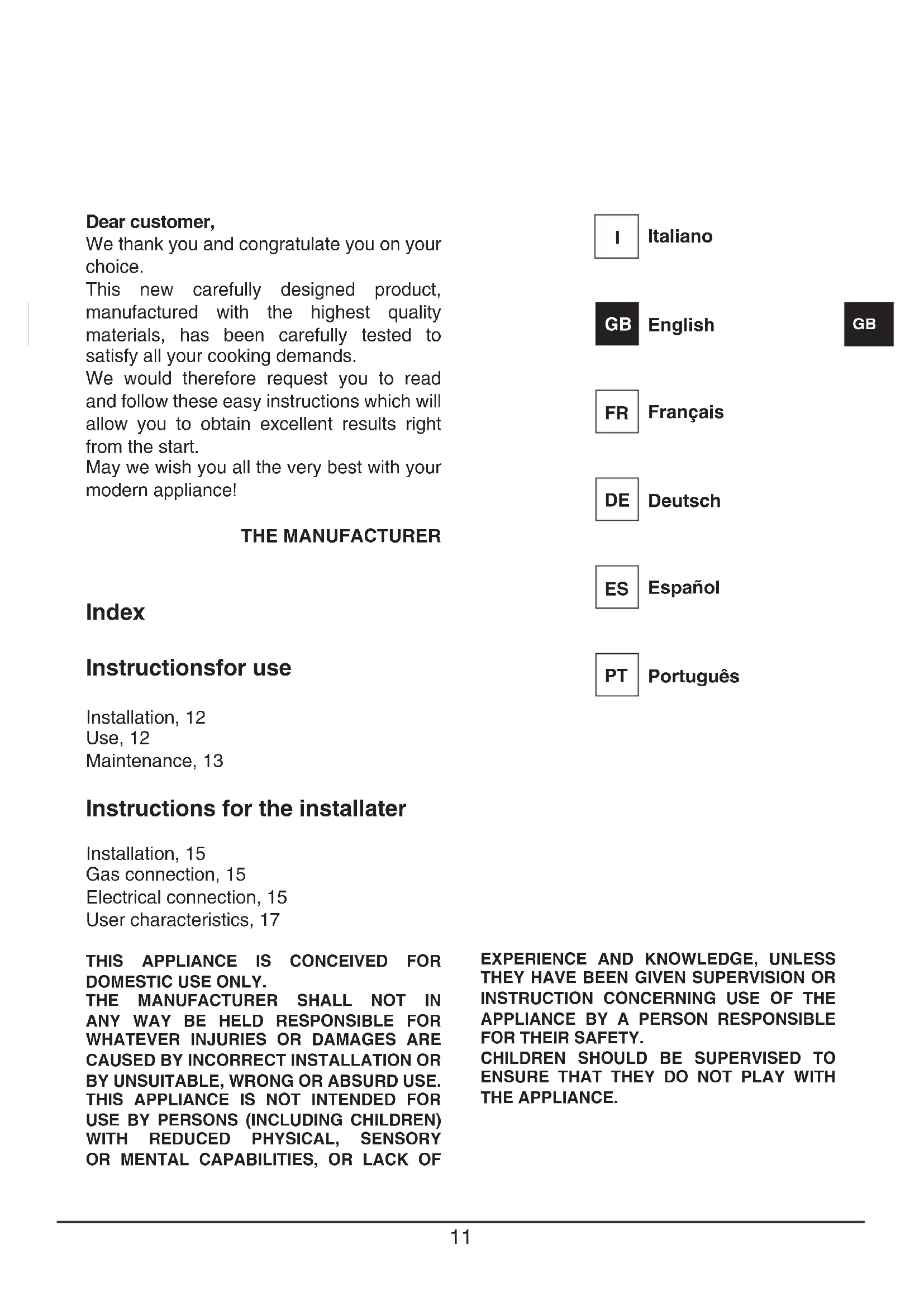 Index Instructionsfor use Installation, 12 Use, 12 Maintenance, 13 Instructions for the installater Installation, 15 Gas connection, 15 Electrical connection, 15 User characteristics, 17 THIS APPLIANCE IS CONCEIVED FOR DOMESTIC USE ONLY. THE MANUFACTURER SHALL NOT IN ANY WAY BE HELD RESPONSIBLE FOR WHATEVER INJURIES OR DAMAGES ARE CAUSED BY INCORRECT INSTALLATION OR BY UNSUITABLE, WRONG OR ABSURD USE. THIS APPLIANCE IS NOT INTENDED FOR USE BY PERSONS (INCLUDING CHILDREN) WITH REDUCED PHYSICAL, SENSORY OR MENTAL CAPABILITIES, OR LACK OF EXPERIENCE AND KNOWLEDGE, UNLESS THEY HAVE BEEN GIVEN SUPERVISION OR INSTRUCTION CONCERNING USE OF THE APPLIANCE BY A PERSON RESPONSIBLE FOR THEIR SAFETY.CHILDREN SHOULD BE SUPERVISED TO ENSURE THAT THEY DO NOT PLAY WITH THE APPLIANCE. Dear customer, We thank you and congratulate you on your choice. This new carefully designed product, manufactured with the highest quality materials, has been carefully tested to satisfy all your cooking demands. We would therefore request you to read and follow these easy instructions which will allow you to obtain excellent results right from the start. May we wish you all the very best with your modern appliance! THE MANUFACTURER Italiano