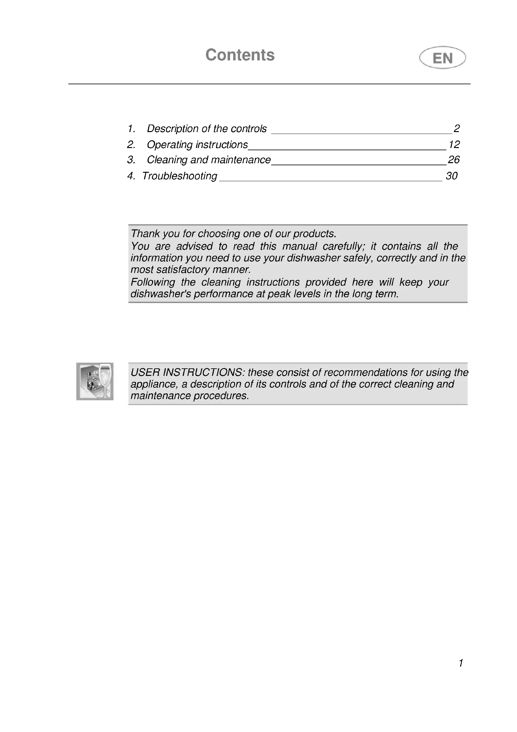 Thank you for choosing one of our products. You are advised to read this manual carefully; it contains all the information you need to use your dishwasher safely, correctly and in the most satisfactory manner. Following the cleaning instructions provided here will keep your dishwasher's performance at peak levels in the long term.