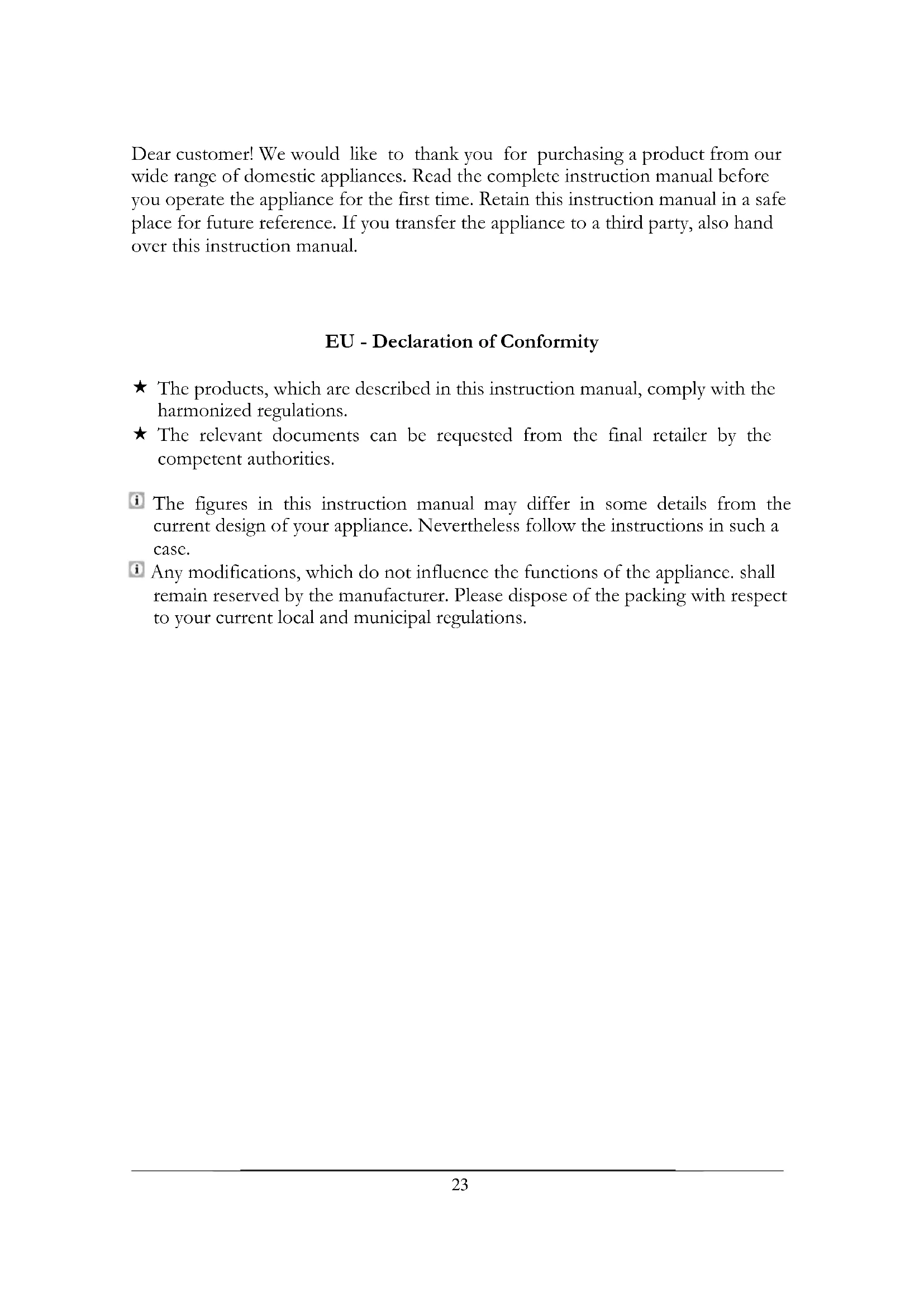 The relevant documents can be requested from the final retailer by the competent authorities. The figures in this instruction manual may differ in some details from the current design of your appliance. Nevertheless follow the instructions in such a case. Any modifications, which do not influence the functions of the appliance. shall remain reserved by the manufacturer. Please dispose of the packing with respect to your current local and municipal regulations.24