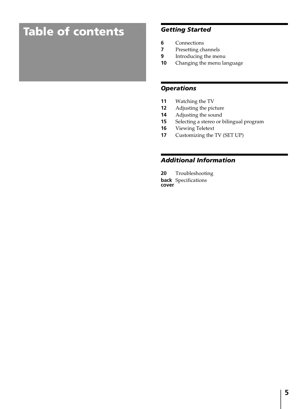 Additional Information 20 Troubleshooting back Specifications cover