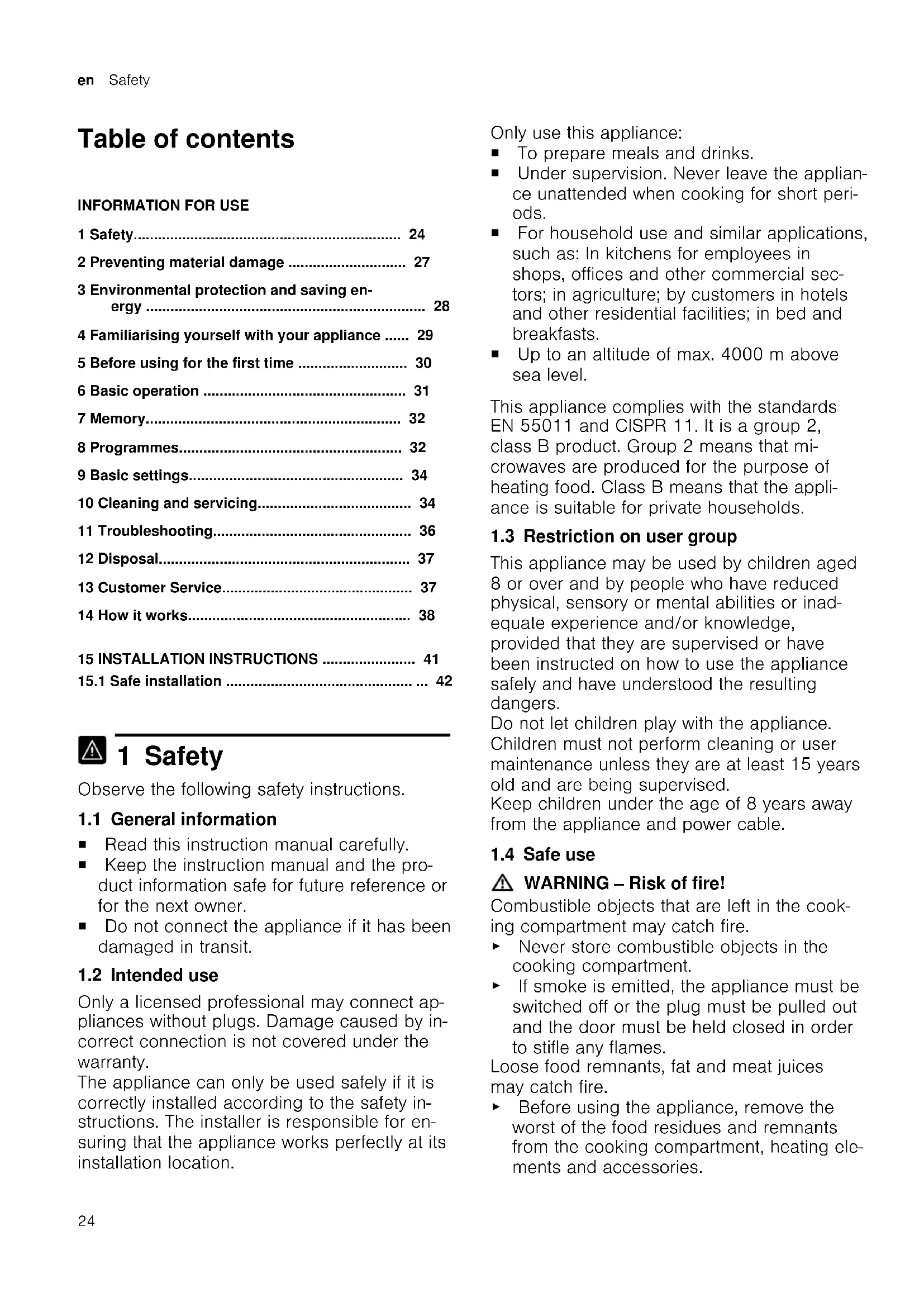 1 Safety Observe the following safety instructions. 1.1 General information ¡ Read this instruction manual carefully. ¡ Keep the instruction manual and the pro- duct information safe for future reference or for the next owner. ¡ Do not connect the appliance if it has been damaged in transit. 1.2 Intended use Only a licensed professional may connect ap- pliances without plugs. Damage caused by in- correct connection is not covered under the warranty. The appliance can only be used safely if it is correctly installed according to the safety in- structions. The installer is responsible for en- suring that the appliance works perfectly at its installation location. Only use this appliance: ¡ To prepare meals and drinks. ¡ Under supervision. Never leave the applian- ce unattended when cooking for short peri- ods. ¡ For household use and similar applications, such as: In kitchens for employees in shops, offices and other commercial sec- tors; in agriculture; by customers in hotels and other residential facilities; in bed and breakfasts. ¡ Up to an altitude of max. 4000m above sea level. This appliance complies with the standards EN 55011 and CISPR 11. It is a group 2, class B product. Group 2 means that mi- crowaves are produced for the purpose of heating food. Class B means that the appli- ance is suitable for private households. 1.3 Restriction on user group This appliance may be used by children aged 8 or over and by people who have reduced physical, sensory or mental abilities or inad- equate experience and/or knowledge, provided that they are supervised or have been instructed on how to use the appliance safely and have understood the resulting dangers. Do not let children play with the appliance. Children must not perform cleaning or user maintenance unless they are at least 15 years old and are being supervised. Keep children under the age of 8 years away from the appliance and power cable. 1.4 Safe use WARNING‒Risk of fire! Combustible objects that are left in the cook- ing compartment may catch fire. ▶ Never store combustible objects in the cooking compartment. ▶ If smoke is emitted, the appliance must be switched off or the plug must be pulled out and the door must be held closed in order to stifle any flames. Loose food remnants, fat and meat juices may catch fire. ▶ Before using the appliance, remove the worst of the food residues and remnants from the cooking compartment, heating ele- ments and accessories.Safety en