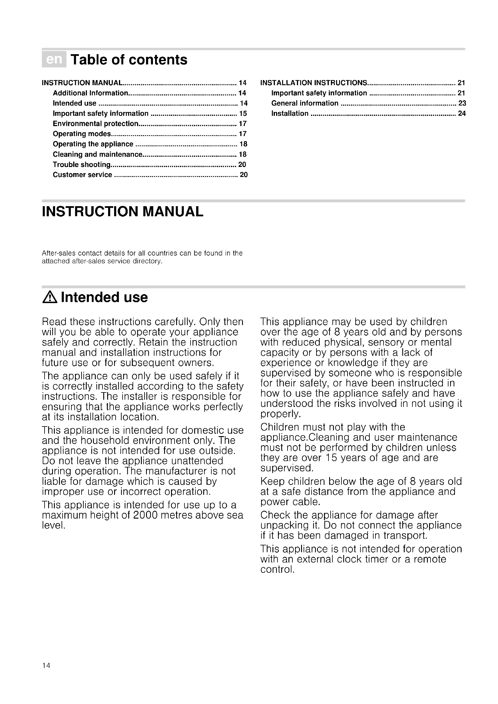 - Installation INSTRUCTION MANUAL Additional Information After-sales contact details for all countries can be found in the attached after-sales service directory. : Intended use Intended use Read these instructions carefully. Only then will you be able to operate your appliance safely and correctly. Retain the instruction manual and installation instructions for future use or for subsequent owners. The appliance can only be used safely if it is correctly installed according to the safety instructions. The installer is responsible for ensuring that the appliance works perfectly at its installation location. This appliance is intended for domestic use and the household environment only. The appliance is not intended for use outside. Do not leave the appliance unattended during operation. The manufacturer is not liable for damage which is caused by improper use or incorrect operation. This appliance is intended for use up to a maximum height of 2000 metres above sea level. This appliance may be used by children over the age of 8 years old and by persons with reduced physical, sensory or mental capacity or by persons with a lack of experience or knowledge if they are supervised by someone who is responsible for their safety, or have been instructed in how to use the appliance safely and have understood the risks involved in not using it properly. Children must not play with the appliance.Cleaning and user maintenance must not be performed by children unless they are over 15 years of age and are supervised. Keep children below the age of 8 years old at a safe distance from the appliance and power cable. Check the appliance for damage after unpacking it. Do not connect the appliance if it has been damaged in transport. This appliance is not intended for operation with an external clock timer or a remote control.15 : Important safety information Impor t a nt saf et y informat i on Danger of suffocation! Packaging material is dangerous to children. Never allow children to play with packaging material. Danger of death! Risk of poisoning from flue gases that are drawn back in. Always ensure adequate fresh air in the room if the appliance is being operated in exhaust air mode at the same time as room air-dependent heat-producing appliance is being operated. Room air-dependent heat-producing appliances (e.g. gas, oil, wood or coal- operated heaters, continuous flow heaters or water heaters) obtain combustion air from the room in which they are installed and discharge the exhaust gases into the open air through an exhaust gas system (e.g. a chimney). In combination with an activated vapour extractor hood, room air is extracted from the kitchen and neighbouring rooms - a partial vacuum is produced if not enough fresh air is supplied. Toxic gases from the chimney or the extraction shaft are sucked back into the living space. p. 24