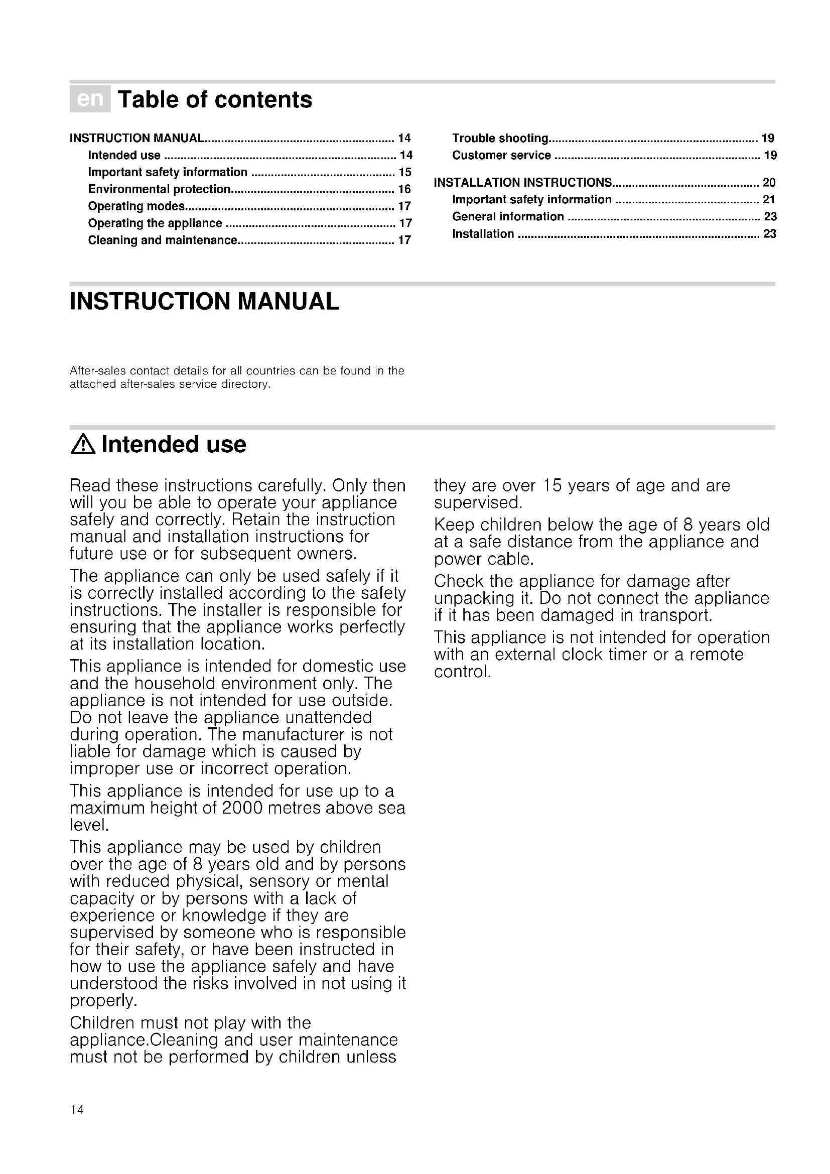 - Installation INSTRUCTION MANUAL Additional Information After-sales contact details for all countries can be found in the attached after-sales service directory. : Intended use Intended use Read these instructions carefully. Only then will you be able to operate your appliance safely and correctly. Retain the instruction manual and installation instructions for future use or for subsequent owners. The appliance can only be used safely if it is correctly installed according to the safety instructions. The installer is responsible for ensuring that the appliance works perfectly at its installation location. This appliance is intended for domestic use and the household environment only. The appliance is not intended for use outside. Do not leave the appliance unattended during operation. The manufacturer is not liable for damage which is caused by improper use or incorrect operation. This appliance is intended for use up to a maximum height of 2000 metres above sea level. This appliance may be used by children over the age of 8 years old and by persons with reduced physical, sensory or mental capacity or by persons with a lack of experience or knowledge if they are supervised by someone who is responsible for their safety, or have been instructed in how to use the appliance safely and have understood the risks involved in not using it properly. Children must not play with the appliance.Cleaning and user maintenance must not be performed by children unless they are over 15 years of age and are supervised. Keep children below the age of 8 years old at a safe distance from the appliance and power cable. Check the appliance for damage after unpacking it. Do not connect the appliance if it has been damaged in transport. This appliance is not intended for operation with an external clock timer or a remote control.15 : Important safety information Impor t a nt saf et y informat i on Danger of suffocation! Packaging material is dangerous to children. Never allow children to play with packaging material. Danger of death! Risk of poisoning from flue gases that are drawn back in. Always ensure adequate fresh air in the room if the appliance is being operated in exhaust air mode at the same time as room air-dependent heat-producing appliance is being operated. Room air-dependent heat-producing appliances (e.g. gas, oil, wood or coal- operated heaters, continuous flow heaters or water heaters) obtain combustion air from the room in which they are installed and discharge the exhaust gases into the open air through an exhaust gas system (e.g. a chimney). In combination with an activated vapour extractor hood, room air is extracted from the kitchen and neighbouring rooms - a partial vacuum is produced if not enough fresh air is supplied. Toxic gases from the chimney or the extraction shaft are sucked back into the living space. p. 23