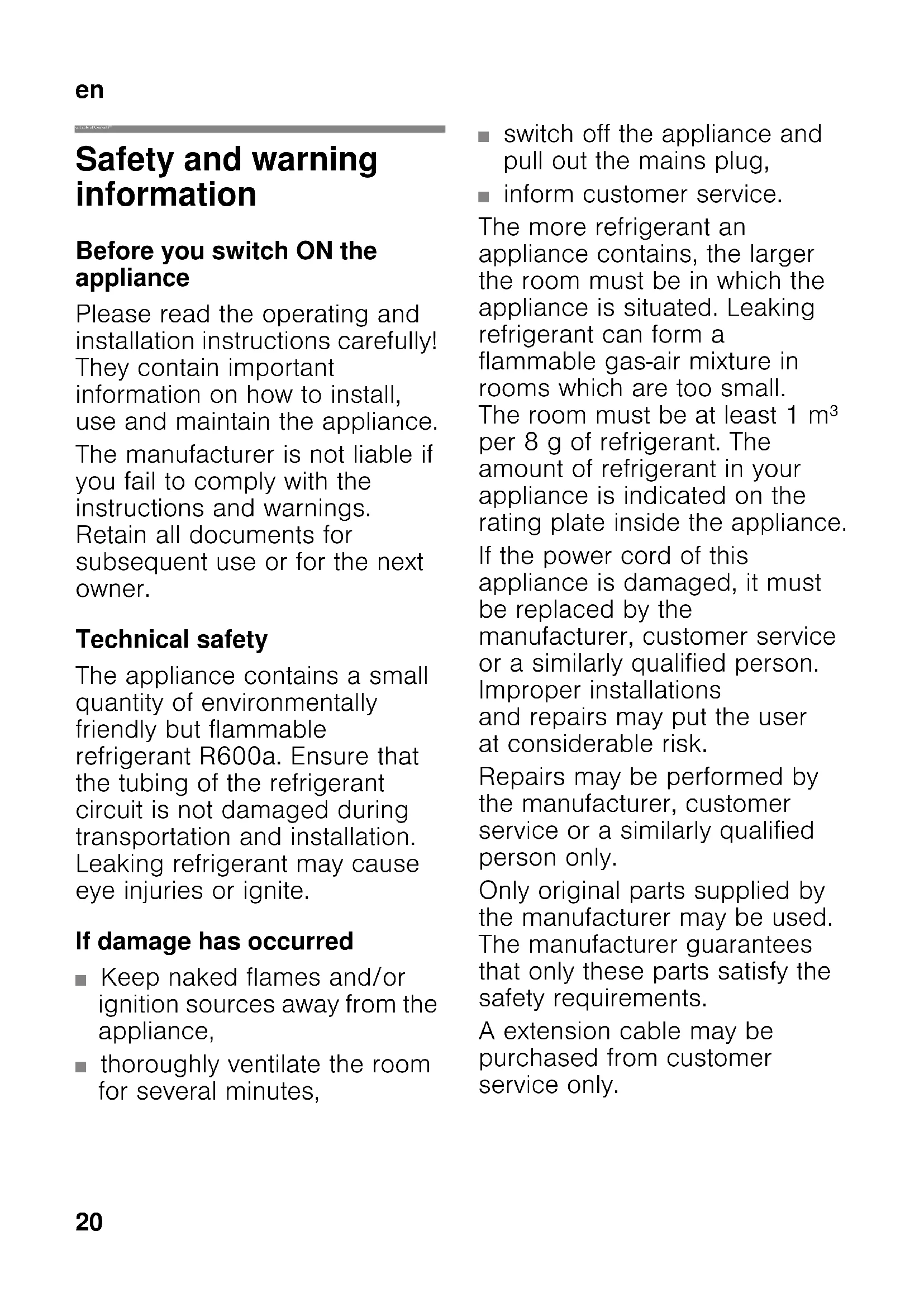 enTable of Contents enInstruction for Use Safety and warning information Before you switch ON the appliance Please read the operating and installation instructions carefully! They contain important information on how to install, use and maintain the appliance. The manufacturer is not liable if you fail to comply with the instructions and warnings. Retain all documents for subsequent use or for the next owner. Technical safety The appliance contains a small quantity of environmentally friendly but flammable refrigerant R600a. Ensure that the tubing of the refrigerant circuit is not damaged during transportation and installation. Leaking refrigerant may cause eye injuries or ignite. If damage has occurred ■ Keep naked flames and/or ignition sources away from the appliance, ■ thoroughly ventilate the room for several minutes, ■ switch off the appliance and pull out the mains plug, ■ inform customer service. The more refrigerant an appliance contains, the larger the room must be in which the appliance is situated. Leaking refrigerant can form a flammable gas-air mixture in rooms which are too small. The room must be at least 1 m³ per 8 g of refrigerant. The amount of refrigerant in your appliance is indicated on the rating plate inside the appliance. If the power cord of this appliance is damaged, it must be replaced by the manufacturer, customer service or a similarly qualified person. Improper installations and repairs may put the user at considerable risk. Repairs may be performed by the manufacturer, customer service or a similarly qualified person only. Only original parts supplied by the manufacturer may be used. The manufacturer guarantees that only these parts satisfy the safety requirements. A extension cable may be purchased from customer service only.en