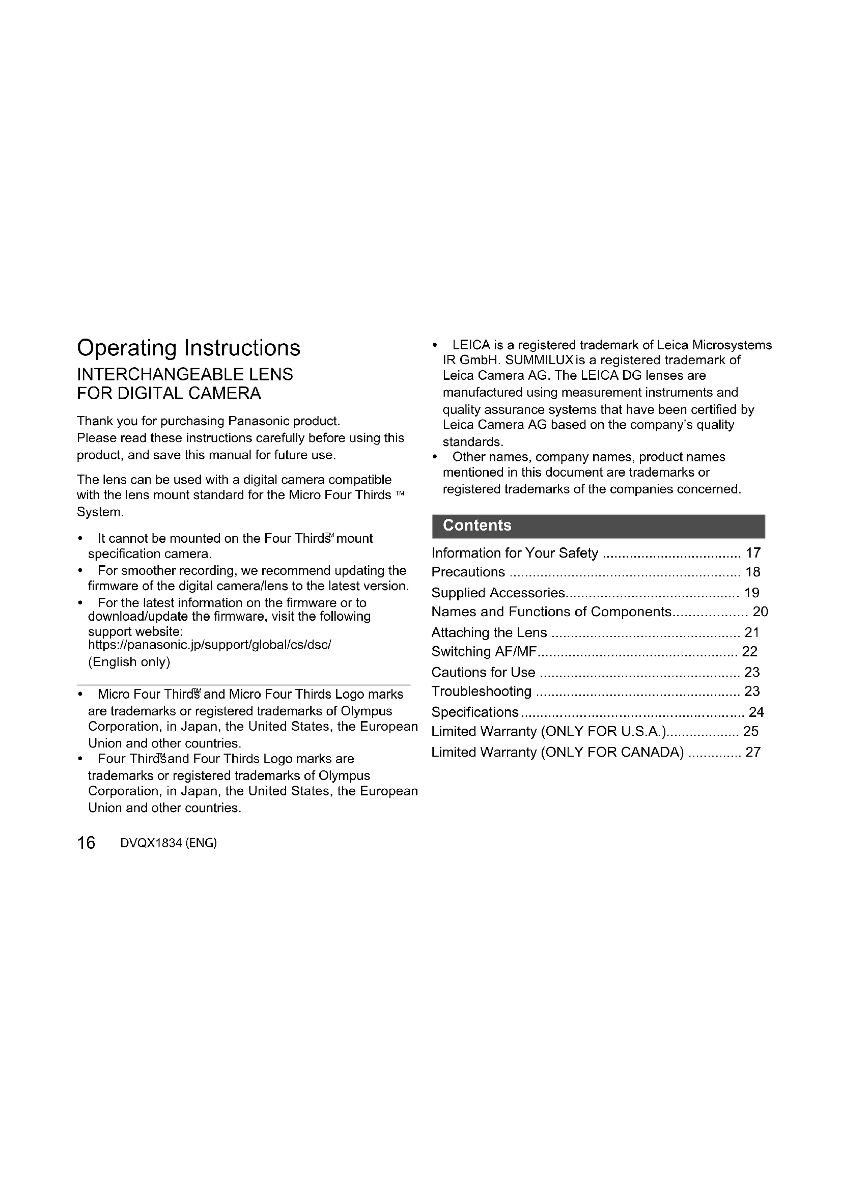 Thank you for purchasing Panasonic product.Please read these instructions carefully before using this product, and save this manual for future use.The lens can be used with a digital camera compatible with the lens mount standard for the Micro Four Thirds