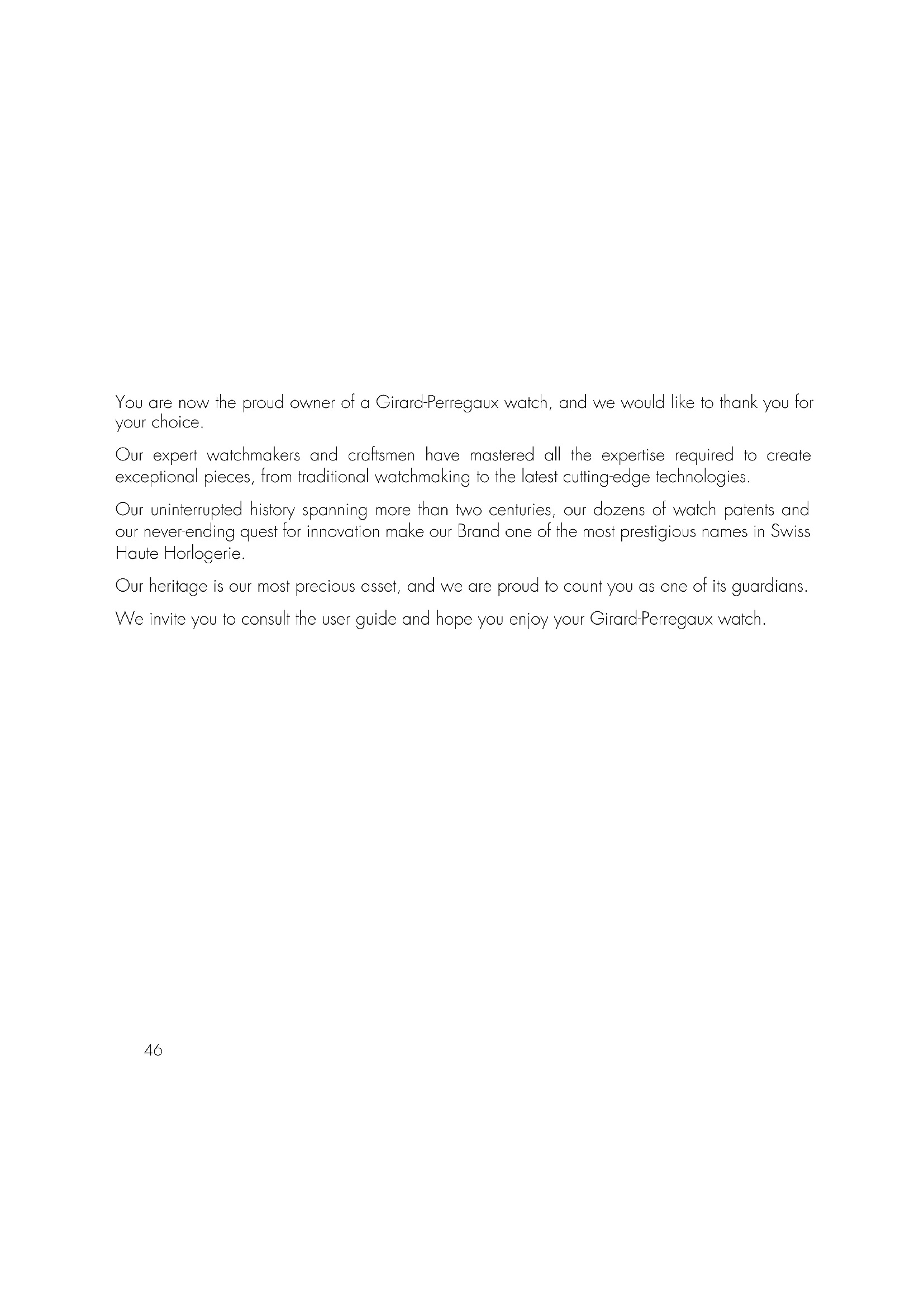 PERPETUAL CALENDAR 7846 You are now the proud owner of a Girard-Perregaux watch, and we would like to thank you for your choice. Our expert watchmakers and craftsmen have mastered all the expertise required to create exceptional pieces, from traditional watchmaking to the latest cutting-edge technologies. Our uninterrupted history spanning more than two centuries, our dozens of watch patents and our never-ending quest for innovation make our Brand one of the most prestigious names in Swiss Haute Horlogerie. Our heritage is our most precious asset, and we are proud to count you as one of its guardians. 7EžINVITEžYOUžTOžCONSULTžTHEžUSERžGUIDEžANDžHOPEžYOUžENJOYžYOURž'IRARD0ERREGAUXžWATCH47 English INTERNATIONAL WARRANTY The international warranty below is applicable to all Girard-Perregaux watches sold by Girard- Perregaux brand authorized dealers and submitted for repair or inspection under warranty in all countries. Only Girard-Perregaux authorized Repair Centers are authorized to provide the service set out by the international warranty, in accordance with Girard-Perregaux’s instructions. Any service, repairs or other operations on your watch not performed by a Girard-Perregaux authorized Repair Center shall render the international warranty void. We guarantee your watch against any lack of conformity and against any defect due to the materials used for a period of TWOž YEARS from the purchase date. If during this period your timepiece were to exhibit one of these defects, we are committed to repairing it free of charge. Once the warranty period has expired, repairs will be invoiced for parts and labor. 4Ož BEžENTITLEDžTOžTHISžWARRANTYžYOUžMUSTžSUBMITžAžCOPYžOFžTHEžWARRANTYžCERTIżCATEžPROPERLYž completed, dated, stamped and signed by an authorized dealer or distributor. You are therefore advised TOžKEEPžTHEž'IRARD0ERREGAUXžINTERNATIONALžWARRANTYžCERTIżCATEžSAFE, as it is the only document validating the warranty. If need be, we recommend giving the watch to be inspected or repaired to one of our exclusive distributors or authorized dealers, who will send it to our nearest authorized Repair Center. You can also send your watch directly to one of our authorized Repair Centers. )FžPOSTINGžYOURžWATCH, we recommend packaging it very carefully and sending by secure mail, to prevent any incident in transit.48 Girard-Perregaux can under no circumstances guarantee the authenticity of Girard-Perregaux PRODUCTSžACQUIREDžOUTSIDEžITSžOFżCIALžDISTRIBUTIONžANDžAUTHORIZEDžDEALERžNETWORK 4HISžWARRANTYžENTITLESžYOUžTOžSPECIżCžAFOREMENTIONEDžRIGHTSžWHICHžMAYžBEžSUPPLEMENTEDžBYžOTHERž rights varying between countries. 4HEžWARRANTYžDOESžNOTžCOVER - Leather, rubber and fabric straps; - The consequences of wear and normal aging of the watch (in particular scratches, scoring, etc.); - Damage caused deliberately, or resulting from incorrect handling, negligence or an accident; - Damage resulting from abnormal use or misuse (in particular impacts or crushing); ž ž7ATCHESžWITHžTHEžIDENTIżCATIONžNUMBERžORžANYžOTHERžIDENTIżCATIONžMARKžDELIBERATELYžREMOVEDž or altered; - Loss and theft; ž ž$AMAGEžCAUSEDžBYžNATURALžEVENTSžSUCHžASžżREžNATURALžCATASTROPHESžANDžACTSžOFžWAR - Any defect resulting from the addition of one or more accessories not issued from the manufacture Girard-Perregaux will automatically lead to the end of the warranty.49 English