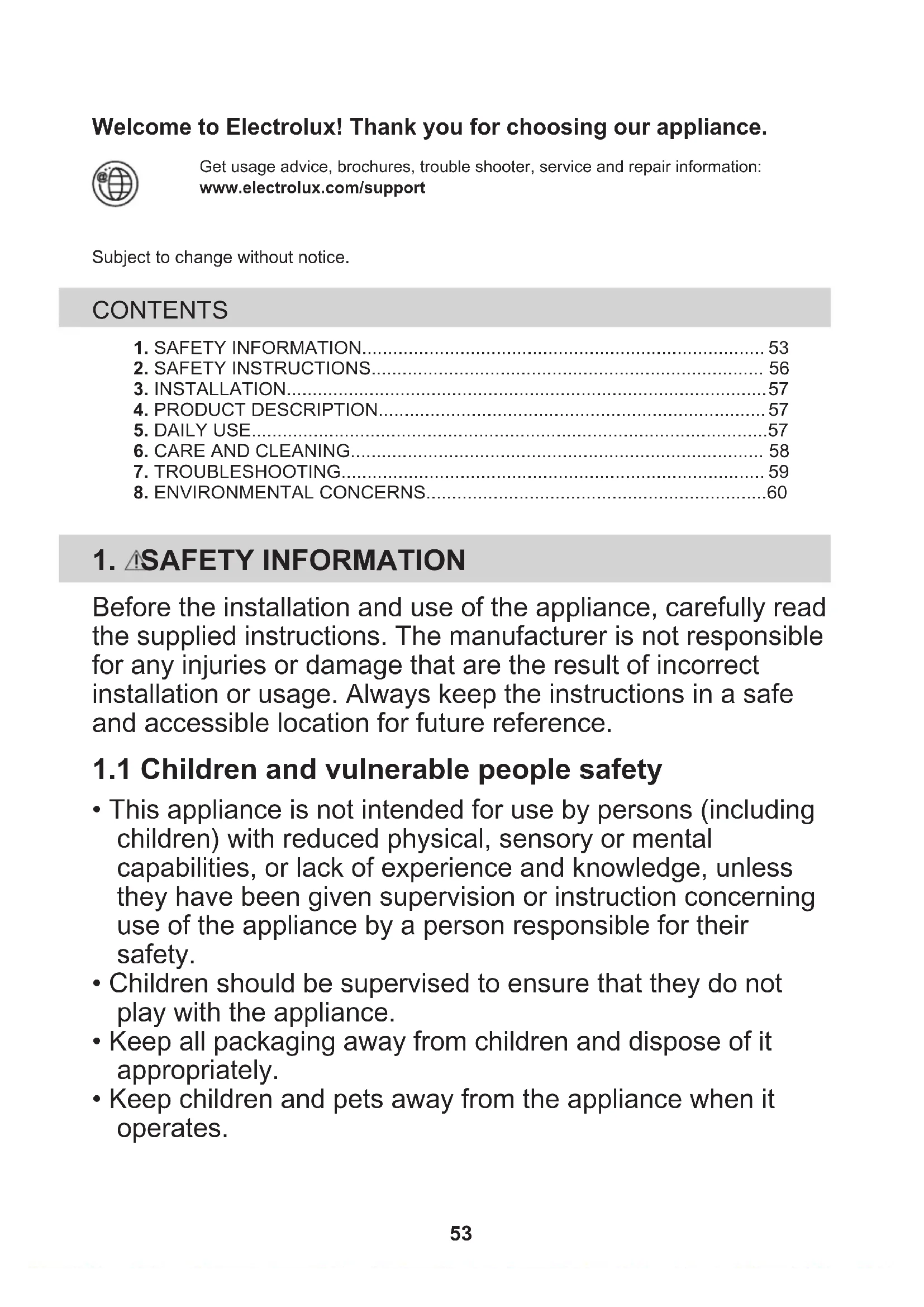 52Welcome to Electrolux! Thank you for choosing our appliance. Get usage advice, brochures, trouble shooter, service and repair information:www.electrolux.com/supportSubject to change without notice. CONTENTS