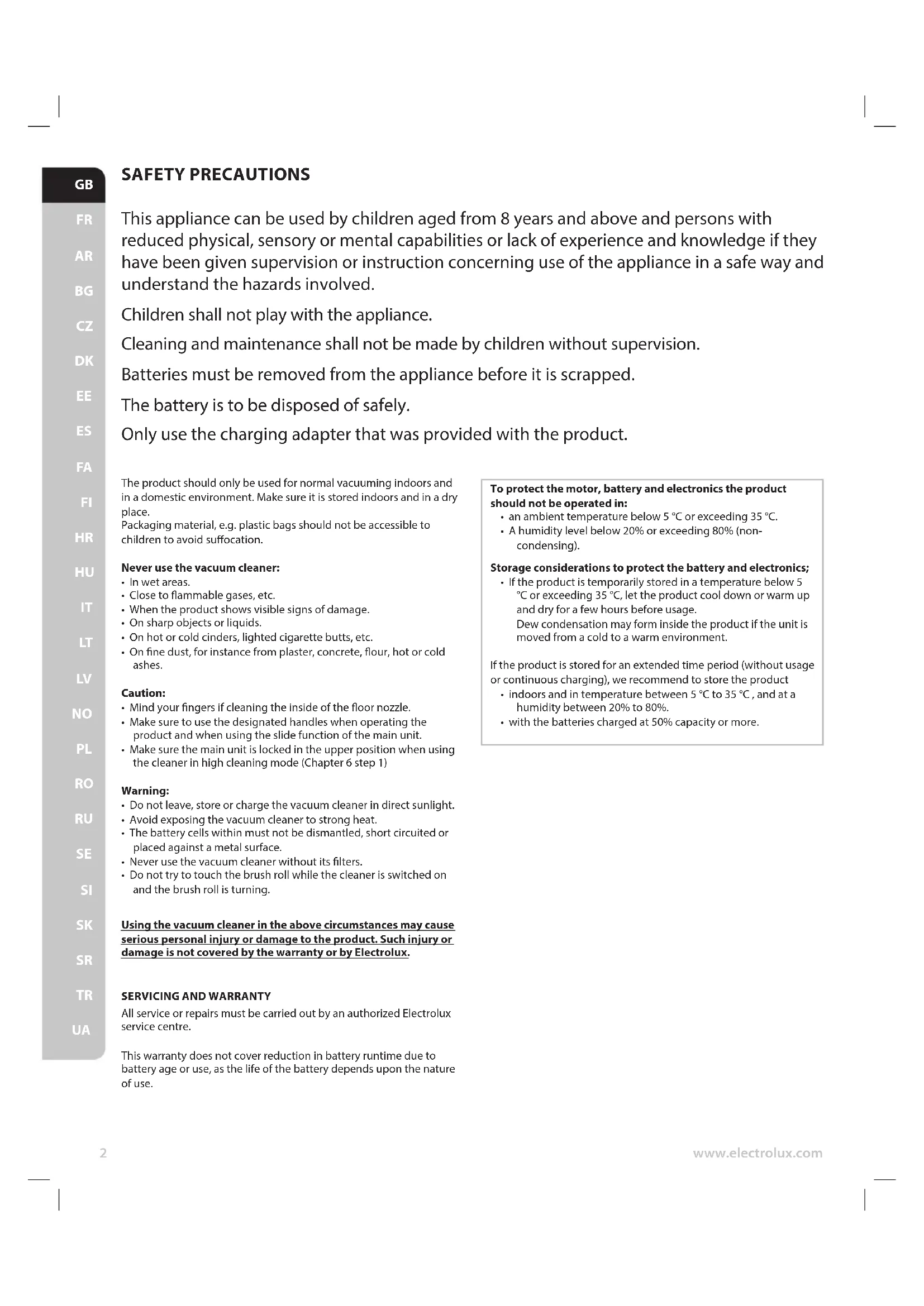 All service or repairs must be carried out by an authorized Electrolux service centre. This warranty does not cover reduction in battery runtime due to battery age or use, as the life of the battery depends upon the nature of use. SAFETY PRECAUTIONS This appliance can be used by children aged from 8 years and above and persons with reduced physical, sensory or mental capabilities or lack of experience and knowledge if they have been given supervision or instruction concerning use of the appliance in a safe way and understand the hazards involved. Children shall not play with the appliance. Cleaning and maintenance shall not be made by children without supervision. Batteries must be removed from the appliance before it is scrapped. The battery is to be disposed of safely. Only use the charging adapter that was provided with the product. To protect the motor, battery and electronics the product should not be operated in: