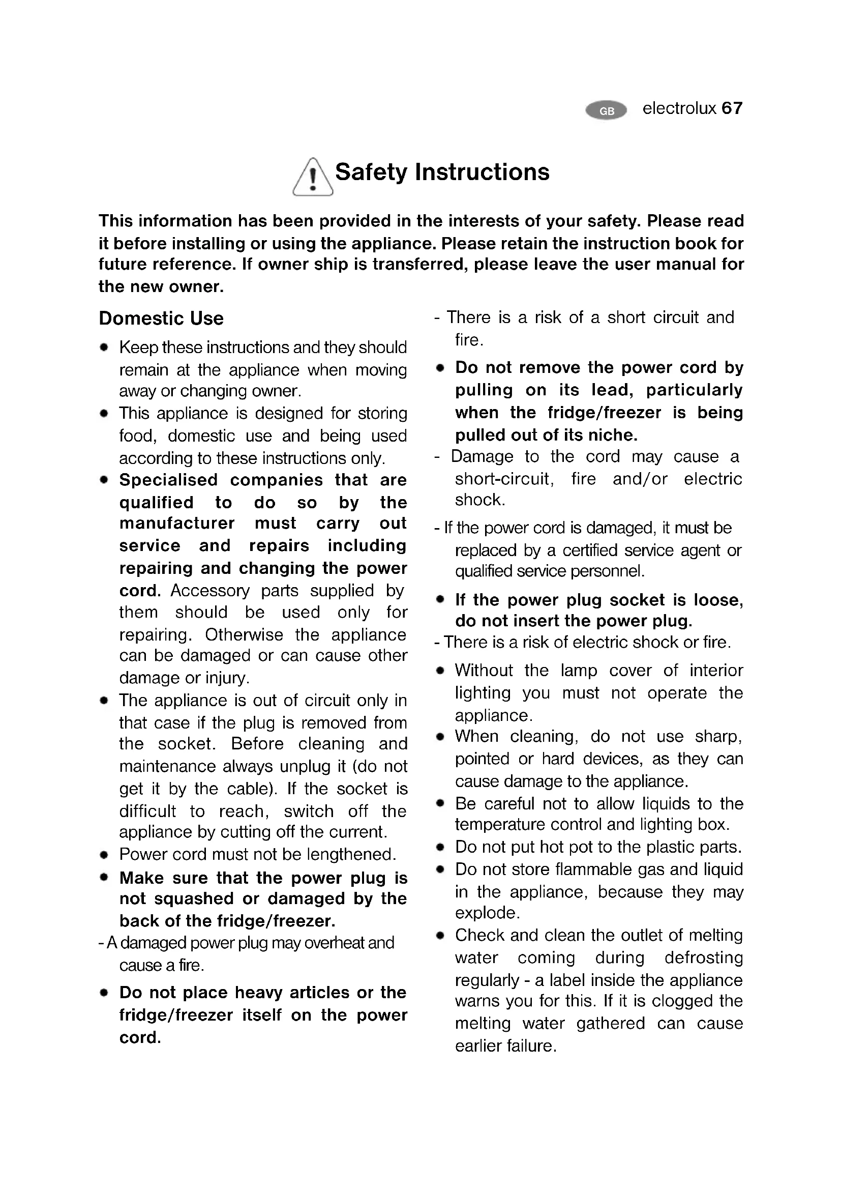 Safety Instructions This information has been provided in the interests of your safety. Please read it before installing or using the appliance. Please retain the instruction book for future reference. If owner ship is transferred, please leave the user manual for the new owner. Domestic Use Keep these instructions and they should remain at the appliance when moving away or changing owner. This appliance is designed for storing food, domestic use and being used according to these instructions only. Specialised companies that are qualified to do so by the manufacturer must carry out service and repairs including repairing and changing the power cord. Accessory parts supplied by them should be used only for repairing. Otherwise the appliance can be damaged or can cause other damage or injury. The appliance is out of circuit only in that case if the plug is removed from the socket. Before cleaning and maintenance always unplug it (do not get it by the cable). If the socket is difficult to reach, switch off the appliance by cutting off the current. Power cord must not be lengthened. Make sure that the power plug is not squashed or damaged by the back of the fridge/freezer. - A damaged power plug may overheat and cause a fire. Do not place heavy articles or the fridge/freezer itself on the power cord. - There is a risk of a short circuit and fire. Do not remove the power cord by pulling on its lead, particularly when the fridge/freezer is being pulled out of its niche. - Damage to the cord may cause a short-circuit, fire and/or electric shock. - If the power cord is damaged, it must be replaced by a certified service agent or qualified service personnel. If the power plug socket is loose, do not insert the power plug. - There is a risk of electric shock or fire. Without the lamp cover of interior lighting you must not operate the appliance. When cleaning, do not use sharp, pointed or hard devices, as they can cause damage to the appliance. Be careful not to allow liquids to the temperature control and lighting box. Do not put hot pot to the plastic parts. Do not store flammable gas and liquid in the appliance, because they may explode. Check and clean the outlet of melting water coming during defrosting regularly - a label inside the appliance warns you for this. If it is clogged the melting water gathered can cause earlier failure.68 electrolux