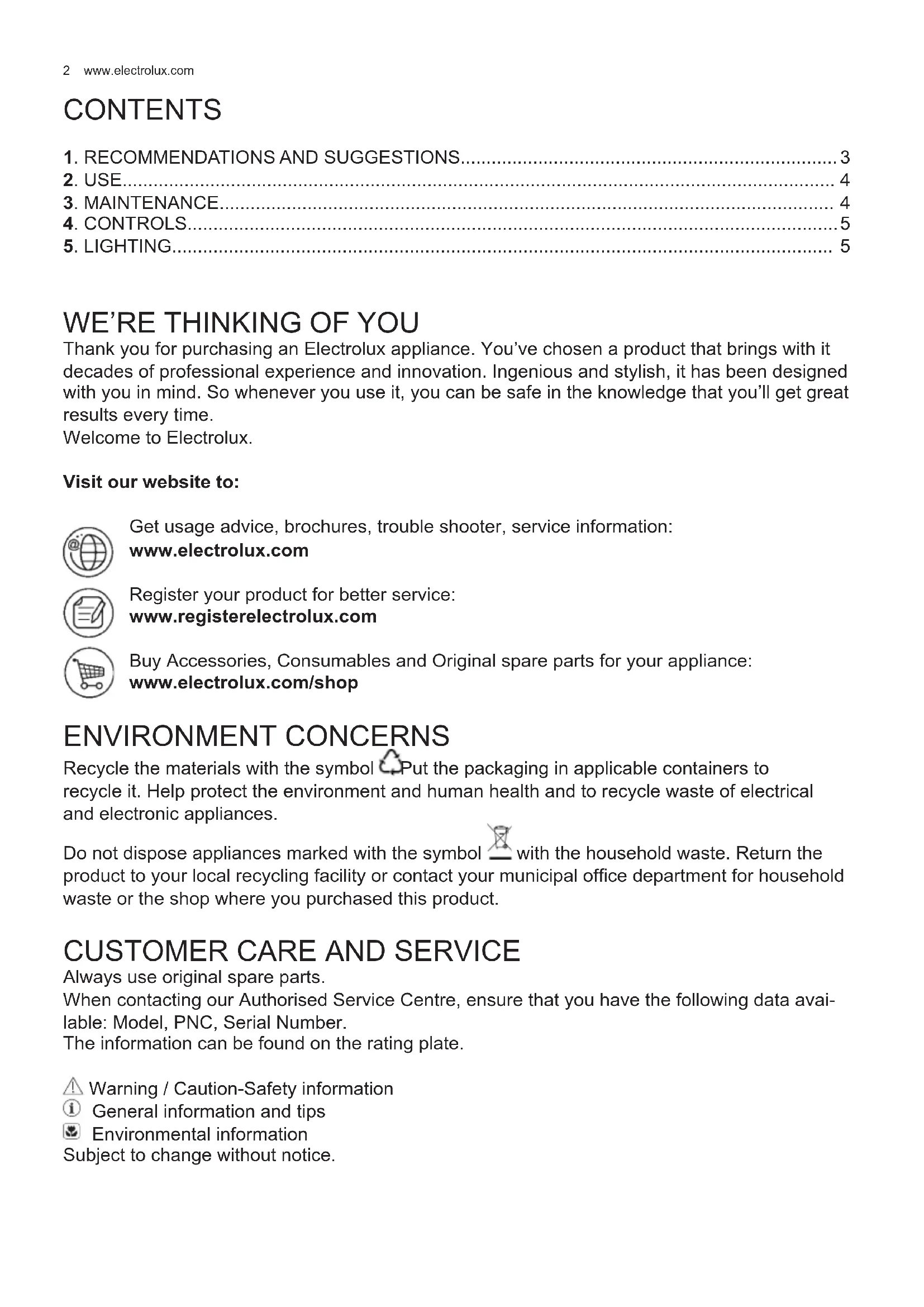 Always use original spare parts. When contacting our Authorised Service Centre, ensure that you have the following data avai- lable: Model, PNC, Serial Number. The information can be found on the rating plate. Warning / Caution-Safety information General information and tips Environmental information Subject to change without notice.3