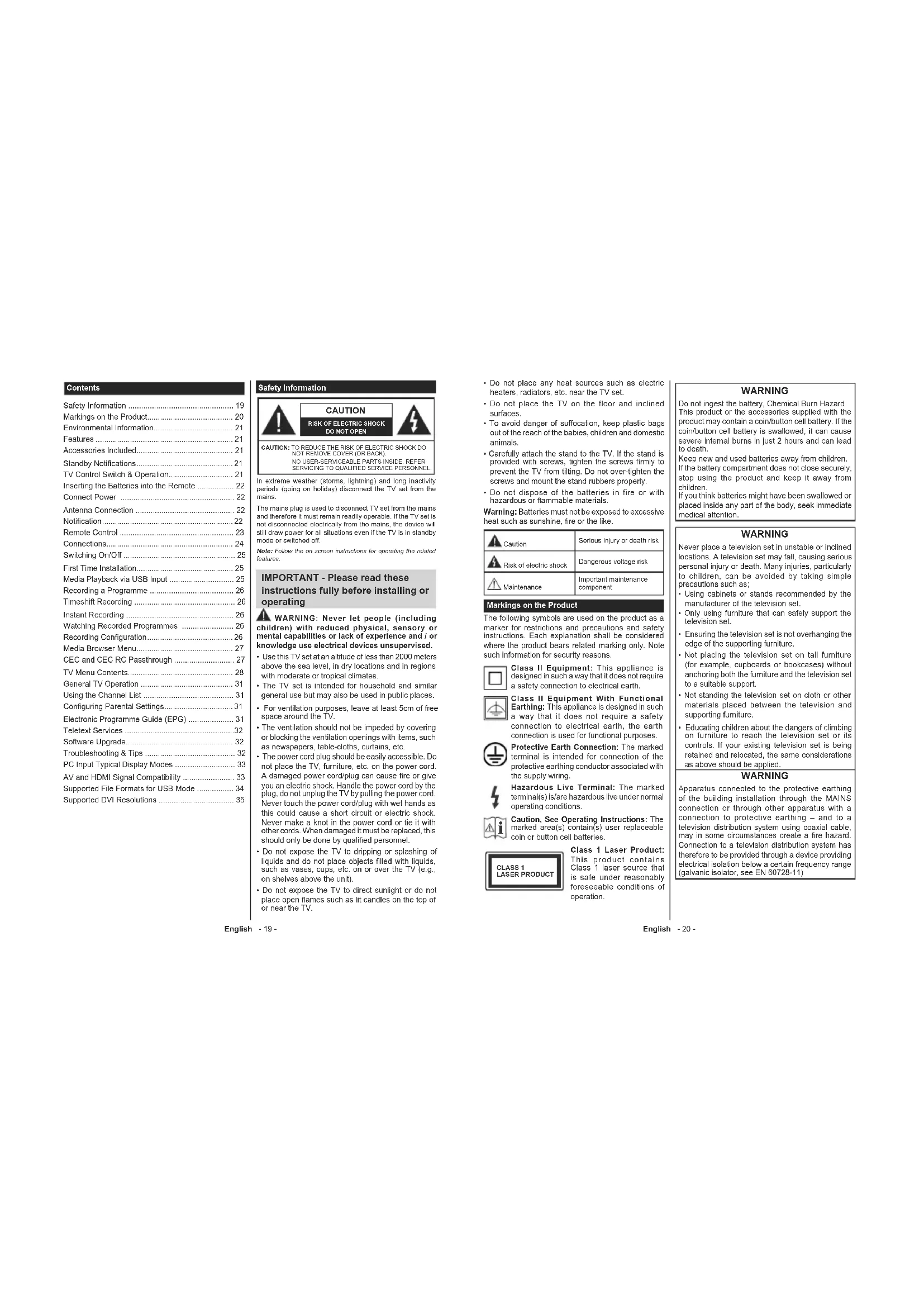 WARNING Do not ingest the battery, Chemical Burn Hazard This product or the accessories supplied with the product may contain a coin/button cell battery. If the coin/button cell battery is swallowed, it can cause severe internal burns in just 2 hours and can lead to death. Keep new and used batteries away from children. If the battery compartment does not close securely, stop using the product and keep it away from children. If you think batteries might have been swallowed or placed inside any part of the body, seek immediate medical attention. WARNING Never place a television set in unstable or inclined locations. A television set may fall, causing serious personal injury or death. Many injuries, particularly to children, can be avoided by taking simple precautions such as; Using cabinets or stands recommended by the manufacturer of the television set. Only using furniture that can safely support the television set. Ensuring the television set is not overhanging the edge of the supporting furniture. Not placing the television set on tall furniture (for example, cupboards or bookcases) without anchoring both the furniture and the television set to a suitable support. Not standing the television set on cloth or other materials placed between the television and supporting furniture. Educating children about the dangers of climbing on furniture to reach the television set or its controls. If your existing television set is being retained and relocated, the same considerations as above should be applied. WARNING Apparatus connected to the protective earthing of the building installation through the MAINS connection or through other apparatus with a connection to protective earthing – and to a television distribution system using coaxial cable, may in some circumstances create a ¿re hazard. Connection to a television distribution system has therefore to be provided through a device providing electrical isolation below a certain frequency range (galvanic isolator, see EN 60728-11)English - 21 -