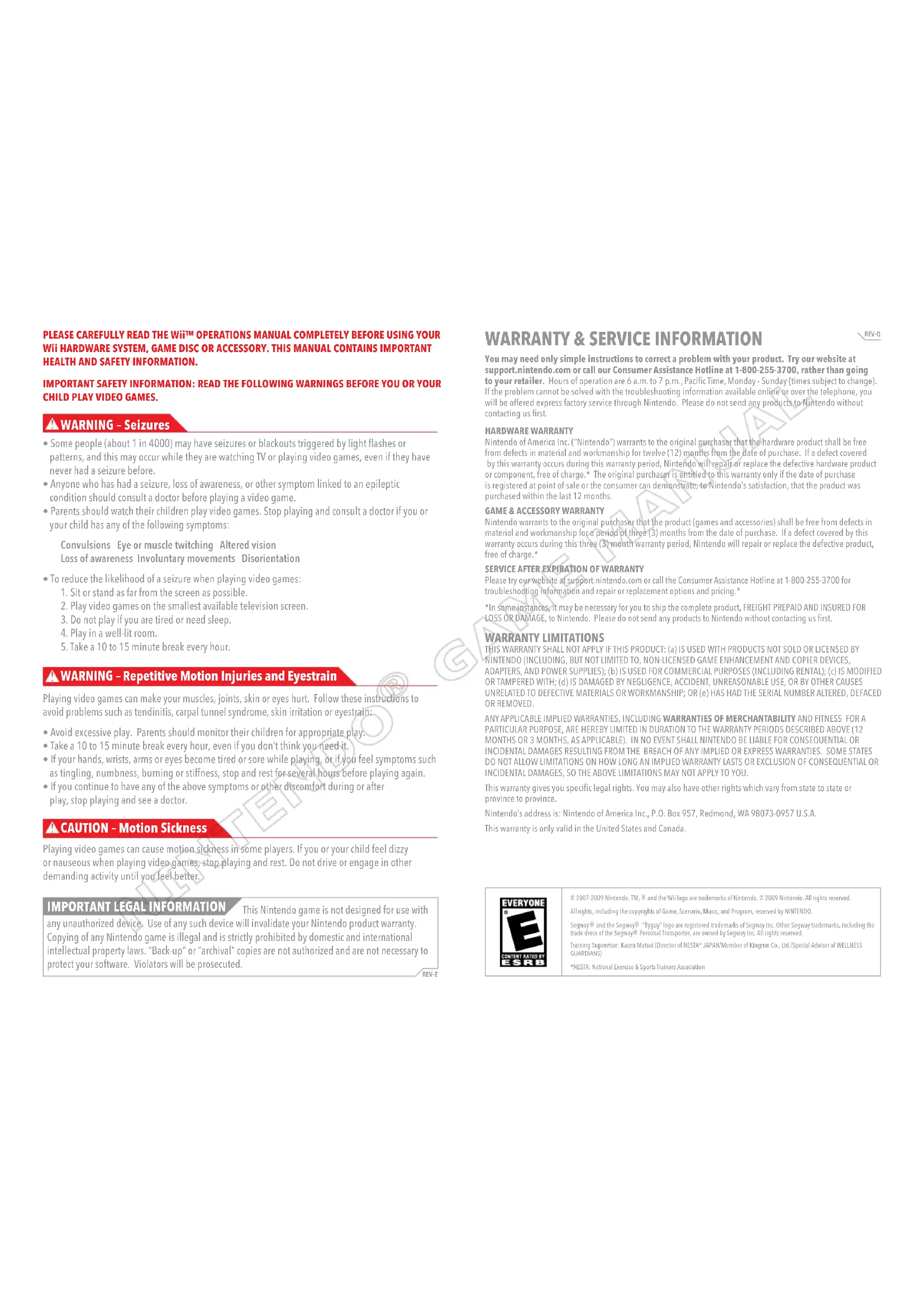 Please try our website at support.nintendo.com or call the Consumer Assistance Hotline at 1-800-255-3700 for troubleshooting information and repair or replacement options and pricing.* *In some instances, it may be necessary for you to ship the complete product, FREIGHT PREPAID AND INSURED FOR LOSS OR DAMAGE, to Nintendo. Please do not send any products to Nintendo without contacting us first. WARRANTY LIMITATIONS THIS WARRANTY SHALL NOT APPLY IF THIS PRODUCT: (a) IS USED WITH PRODUCTS NOT SOLD OR LICENSED BY NINTENDO (INCLUDING, BUT NOT LIMITED TO, NON-LICENSED GAME ENHANCEMENT AND COPIER DEVICES, ADAPTERS, AND POWER SUPPLIES); (b) IS USED FOR COMMERCIAL PURPOSES (INCLUDING RENTAL); (c) IS MODIFIED OR TAMPERED WITH; (d) IS DAMAGED BY NEGLIGENCE, ACCIDENT, UNREASONABLE USE, OR BY OTHER CAUSES UNRELATED TO DEFECTIVE MATERIALS OR WORKMANSHIP; OR (e) HAS HAD THE SERIAL NUMBER ALTERED, DEFACED OR REMOVED. ANY APPLICABLE IMPLIED WARRANTIES, INCLUDING WARRANTIES OF MERCHANTABILITY AND FITNESS FOR A PARTICULAR PURPOSE, ARE HEREBY LIMITED IN DURATION TO THE WARRANTY PERIODS DESCRIBED ABOVE (12 MONTHS OR 3 MONTHS, AS APPLICABLE). IN NO EVENT SHALL NINTENDO BE LIABLE FOR CONSEQUENTIAL OR INCIDENTAL DAMAGES RESULTING FROM THE BREACH OF ANY IMPLIED OR EXPRESS WARRANTIES. SOME STATES DO NOT ALLOW LIMITATIONS ON HOW LONG AN IMPLIED WARRANTY LASTS OR EXCLUSION OF CONSEQUENTIAL OR INCIDENTAL DAMAGES, SO THE ABOVE LIMITATIONS MAY NOT APPLY TO YOU. This warranty gives you specific legal rights. You may also have other rights which vary from state to state or province to province. Nintendo’s address is: Nintendo of America Inc., P.O. Box 957, Redmond, WA 98073-0957 U.S.A. This warranty is only valid in the United States and Canada. PLEASE CAREFULLY READ THE Wii™ OPERATIONS MANUAL COMPLETELY BEFORE USING YOUR Wii HARDWARE SYSTEM, GAME DISC OR ACCESSORY. THIS MANUAL CONTAINS IMPORTANT HEALTH AND SAFETY INFORMATION. IMPORTANT SAFETY INFORMATION: READ THE FOLLOWING WARNINGS BEFORE YOU OR YOUR CHILD PLAY VIDEO GAMES.