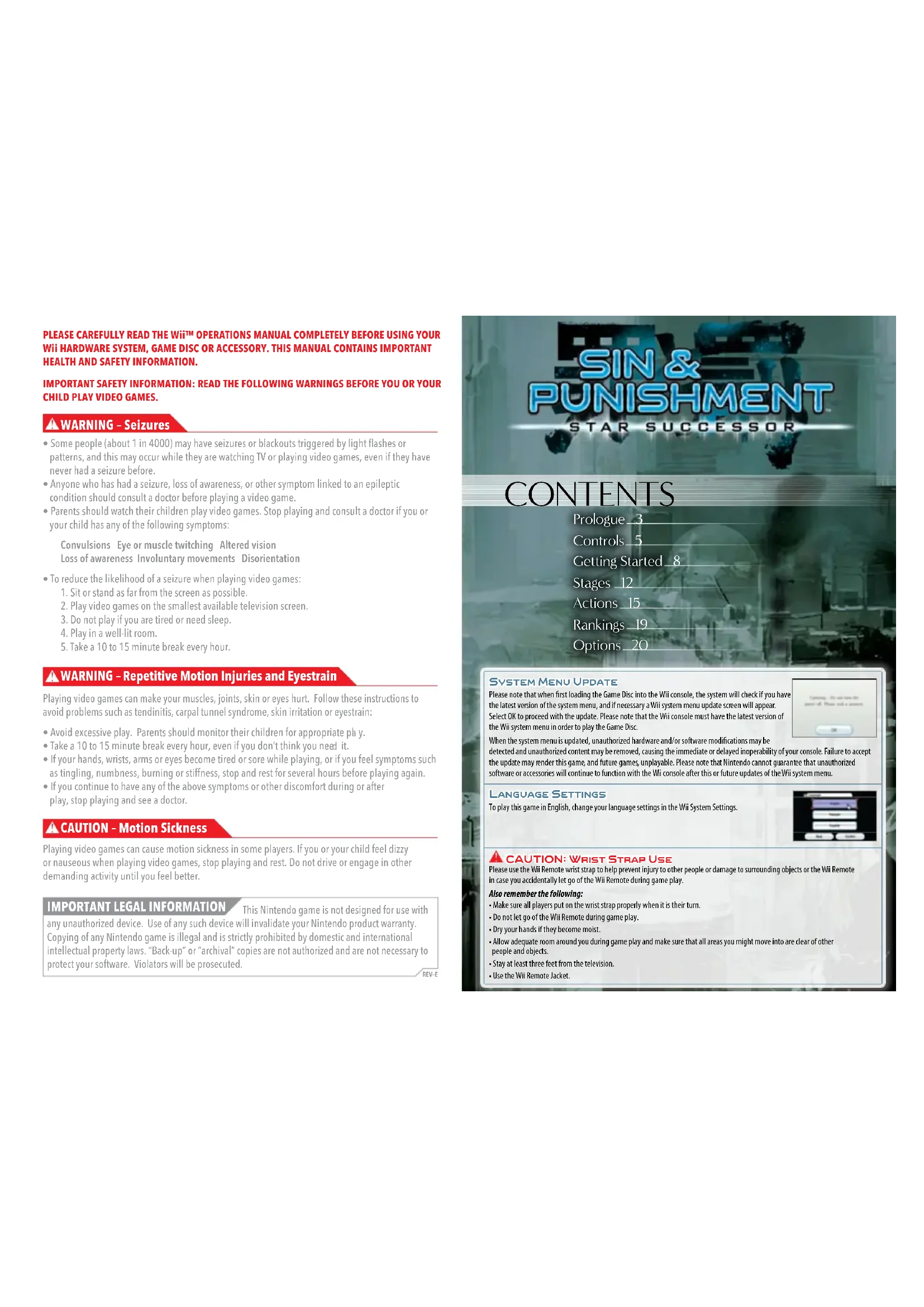 www.nintendo.com NINTENDO OF AMERICA INC. P.O. BOX 957, REDMOND, WA 98073-0957 U.S.A. 70043A 70043A_Wii_Sin Punishment_SS_manual.indd 2-3 5/12/10 12:50:06 PMCONTENTS Prologue 3 Controls 5 Getting Started 8 Stages 12 Actions 15 Rankings 19 Options 20 System Menu Update Please note that when rst loading the Game Disc into the Wii console, the system will check if you have the latest version of the system menu, and if necessary a Wii system menu update screen will appear. Select OK to proceed with the update. Please note that the Wii console must have the latest version of the Wii system menu in order to play the Game Disc.When the system menu is updated, unauthorized hardware and/or software modications may be detected and unauthorized content may be removed, causing the immediate or delayed inoperability of your console. Failure to accept the update may render this game, and future games, unplayable. Please note that Nintendo cannot guarantee that unauthorized software or accessories will continue to function with the Wii console after this or future updates of the Wii system menu. Language Settings To play this game in English, change your language settings in the Wii System Settings. CAUTION: Wrist Strap Use Please use the Wii Remote wrist strap to help prevent injury to other people or damage to surrounding objects or the Wii Remote in case you accidentally let go of the Wii Remote during game play. Also remember the following: • Make sure all players put on the wrist strap properly when it is their turn. • Do not let go of the Wii Remote during game play. • Dry your hands if they become moist. • Allow adequate room around you during game play and make sure that all areas you might move into are clear of other people and objects. • Stay at least three feet from the television.• Use the Wii Remote Jacket. PLEASE CAREFULLY READ THE Wii™ OPERATIONS MANUAL COMPLETELY BEFORE USING YOUR Wii HARDWARE SYSTEM, GAME DISC OR ACCESSORY. THIS MANUAL CONTAINS IMPORTANT HEALTH AND SAFETY INFORMATION. IMPORTANT SAFETY INFORMATION: READ THE FOLLOWING WARNINGS BEFORE YOU OR YOUR CHILD PLAY VIDEO GAMES.