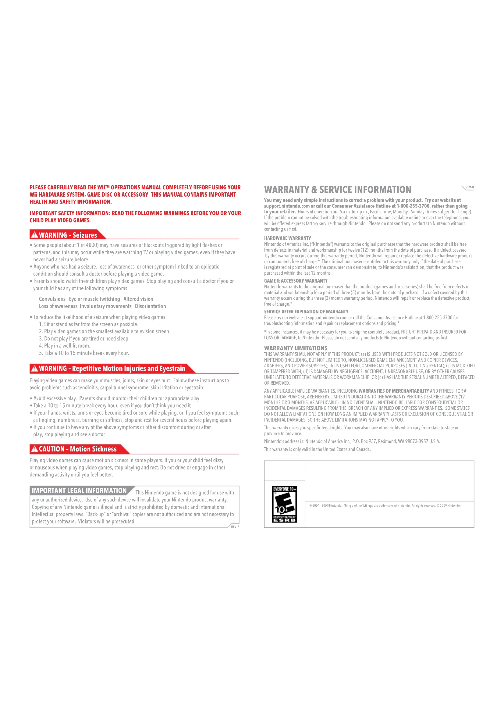 Please try our website at support.nintendo.com or call the Consumer Assistance Hotline at 1-800-255-3700 for troubleshooting information and repair or replacement options and pricing.* *In some instances, it may be necessary for you to ship the complete product, FREIGHT PREPAID AND INSURED FOR LOSS OR DAMAGE, to Nintendo. Please do not send any products to Nintendo without contacting us first. WARRANTY LIMITATIONS THIS WARRANTY SHALL NOT APPLY IF THIS PRODUCT: (a) IS USED WITH PRODUCTS NOT SOLD OR LICENSED BY NINTENDO (INCLUDING, BUT NOT LIMITED TO, NON-LICENSED GAME ENHANCEMENT AND COPIER DEVICES, ADAPTERS, AND POWER SUPPLIES); (b) IS USED FOR COMMERCIAL PURPOSES (INCLUDING RENTAL); (c) IS MODIFIED OR TAMPERED WITH; (d) IS DAMAGED BY NEGLIGENCE, ACCIDENT, UNREASONABLE USE, OR BY OTHER CAUSES UNRELATED TO DEFECTIVE MATERIALS OR WORKMANSHIP; OR (e) HAS HAD THE SERIAL NUMBER ALTERED, DEFACED OR REMOVED. ANY APPLICABLE IMPLIED WARRANTIES, INCLUDING WARRANTIES OF MERCHANTABILITY AND FITNESS FOR A PARTICULAR PURPOSE, ARE HEREBY LIMITED IN DURATION TO THE WARRANTY PERIODS DESCRIBED ABOVE (12 MONTHS OR 3 MONTHS, AS APPLICABLE). IN NO EVENT SHALL NINTENDO BE LIABLE FOR CONSEQUENTIAL OR INCIDENTAL DAMAGES RESULTING FROM THE BREACH OF ANY IMPLIED OR EXPRESS WARRANTIES. SOME STATES DO NOT ALLOW LIMITATIONS ON HOW LONG AN IMPLIED WARRANTY LASTS OR EXCLUSION OF CONSEQUENTIAL OR INCIDENTAL DAMAGES, SO THE ABOVE LIMITATIONS MAY NOT APPLY TO YOU. This warranty gives you specific legal rights. You may also have other rights which vary from state to state or province to province. Nintendo’s address is: Nintendo of America Inc., P.O. Box 957, Redmond, WA 98073-0957 U.S.A. This warranty is only valid in the United States and Canada. PLEASE CAREFULLY READ THE Wii™ OPERATIONS MANUAL COMPLETELY BEFORE USING YOUR Wii HARDWARE SYSTEM, GAME DISC OR ACCESSORY. THIS MANUAL CONTAINS IMPORTANT HEALTH AND SAFETY INFORMATION. IMPORTANT SAFETY INFORMATION: READ THE FOLLOWING WARNINGS BEFORE YOU OR YOUR CHILD PLAY VIDEO GAMES.