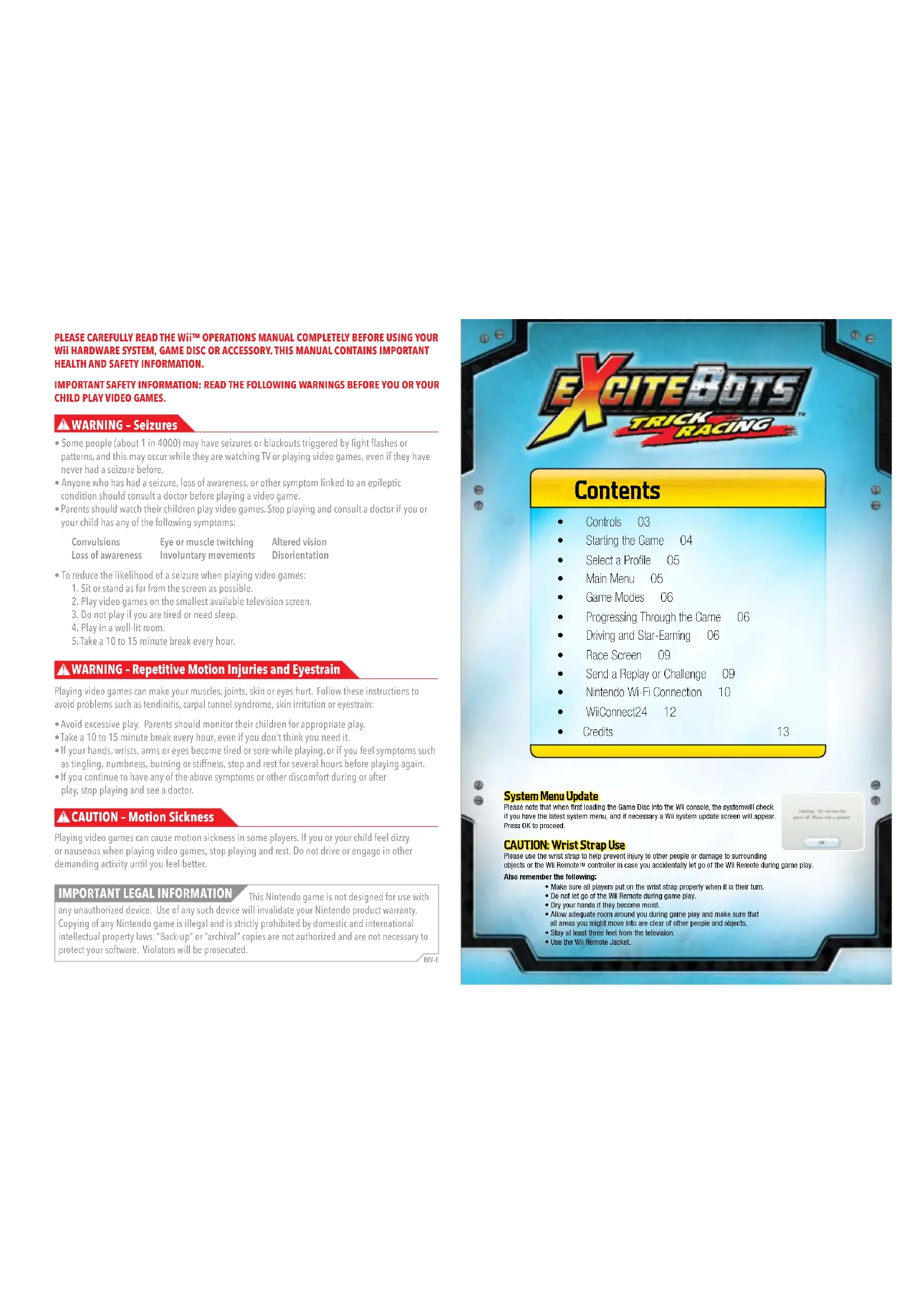 CAUTION – Motion Sickness WARNING – Repetitive Motion Injuries and Eyestrain WARNING – Seizures Wii_Manual_Excitebots.indd 1-2 2/25/09 10:32:26 AM0403 Excitebots: Trick Racing can be played using either the Wii Remote by itself or with the Wii Wheel