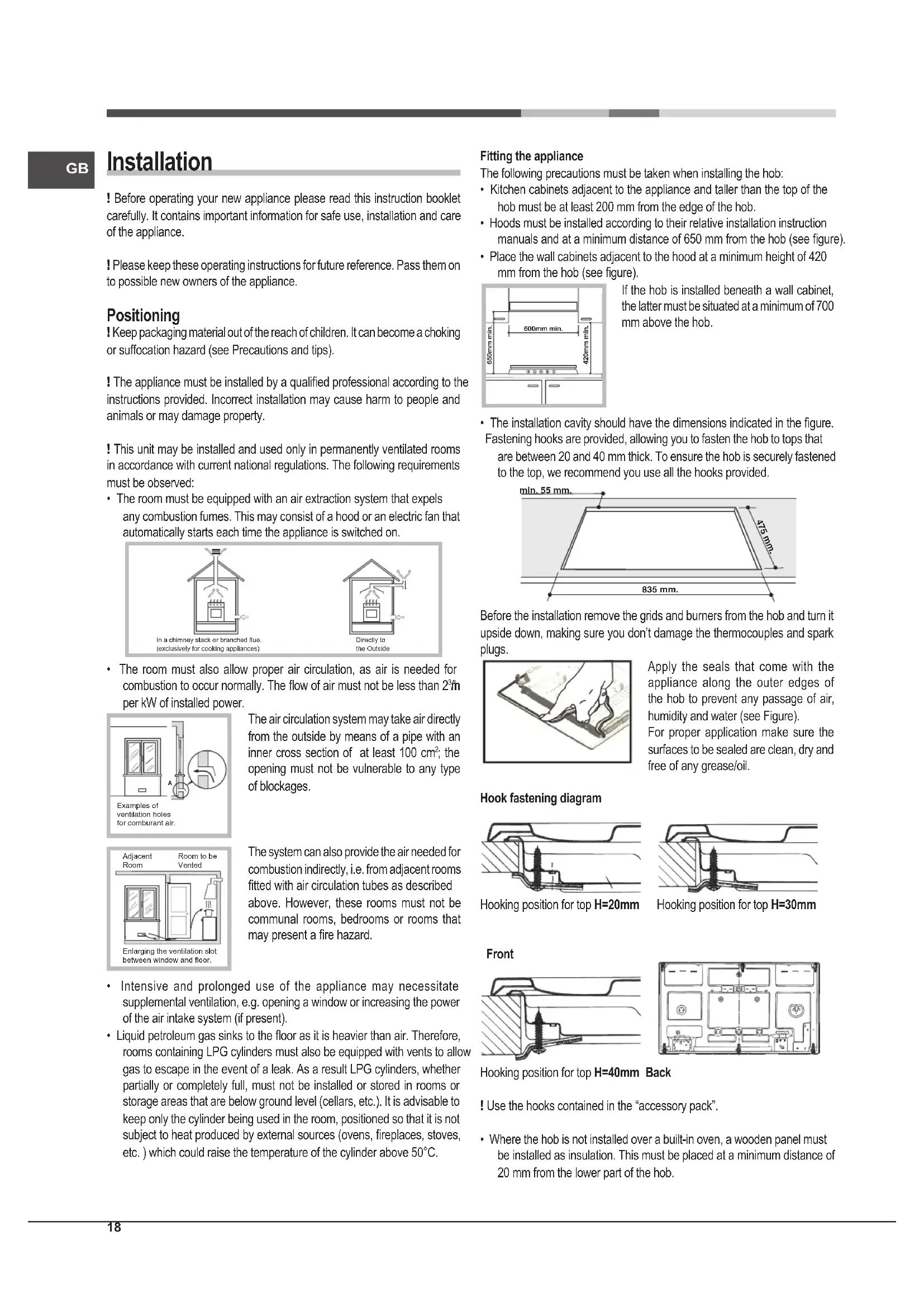 Examples of ventilation holes for comburant air.Enlarging the ventilation slotbetween window and floor.Adjacent Room Room to beVented Fitting the appliance The following precautions must be taken when installing the hob: