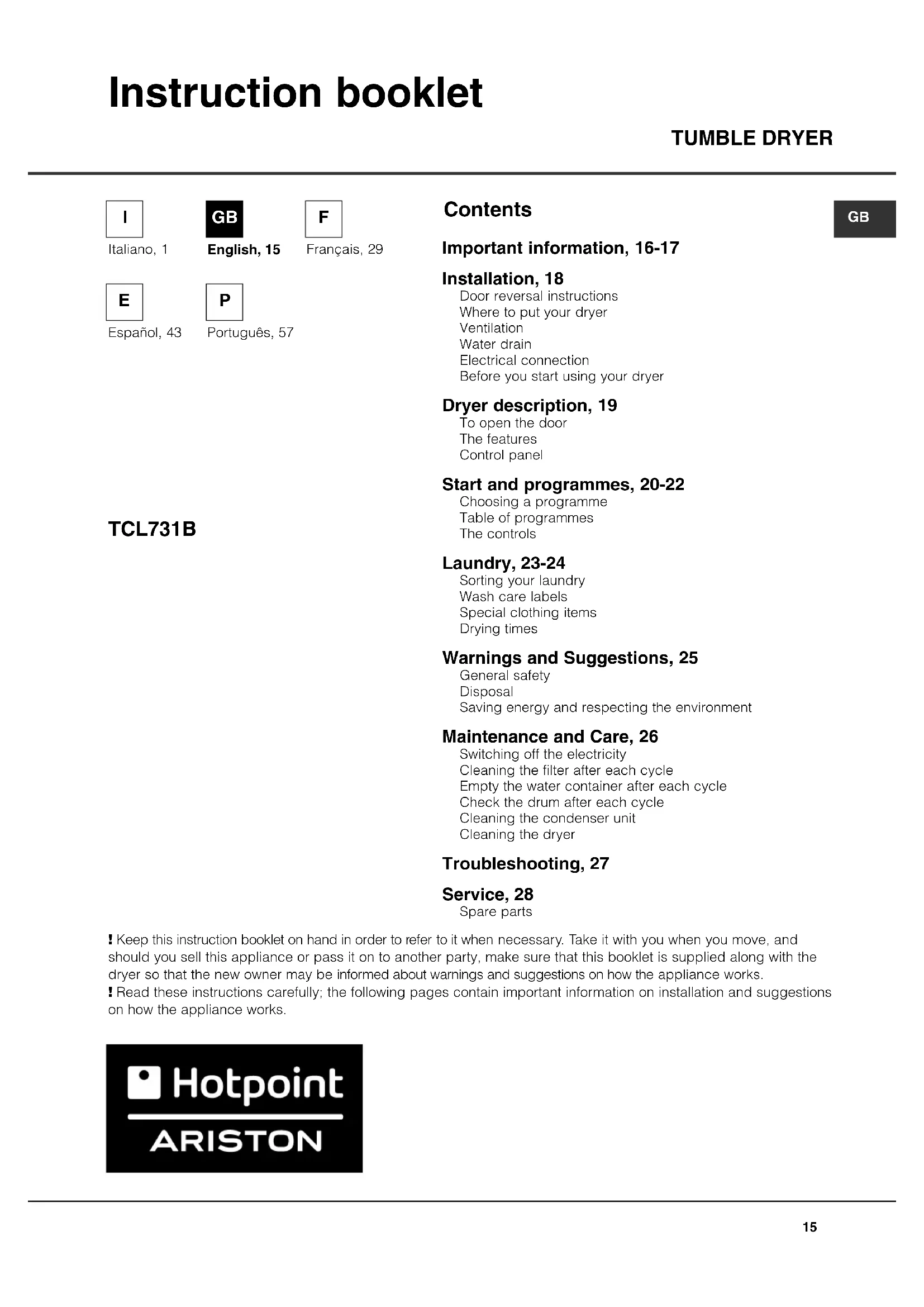 Download the instructions for your Dryer in PDF format for free! Find your manual TCL731B - HOTPOINT ARISTON and take your electronic device back in hand. On this page are published all the documents necessary for the use of your device. TCL731B by HOTPOINT ARISTON.