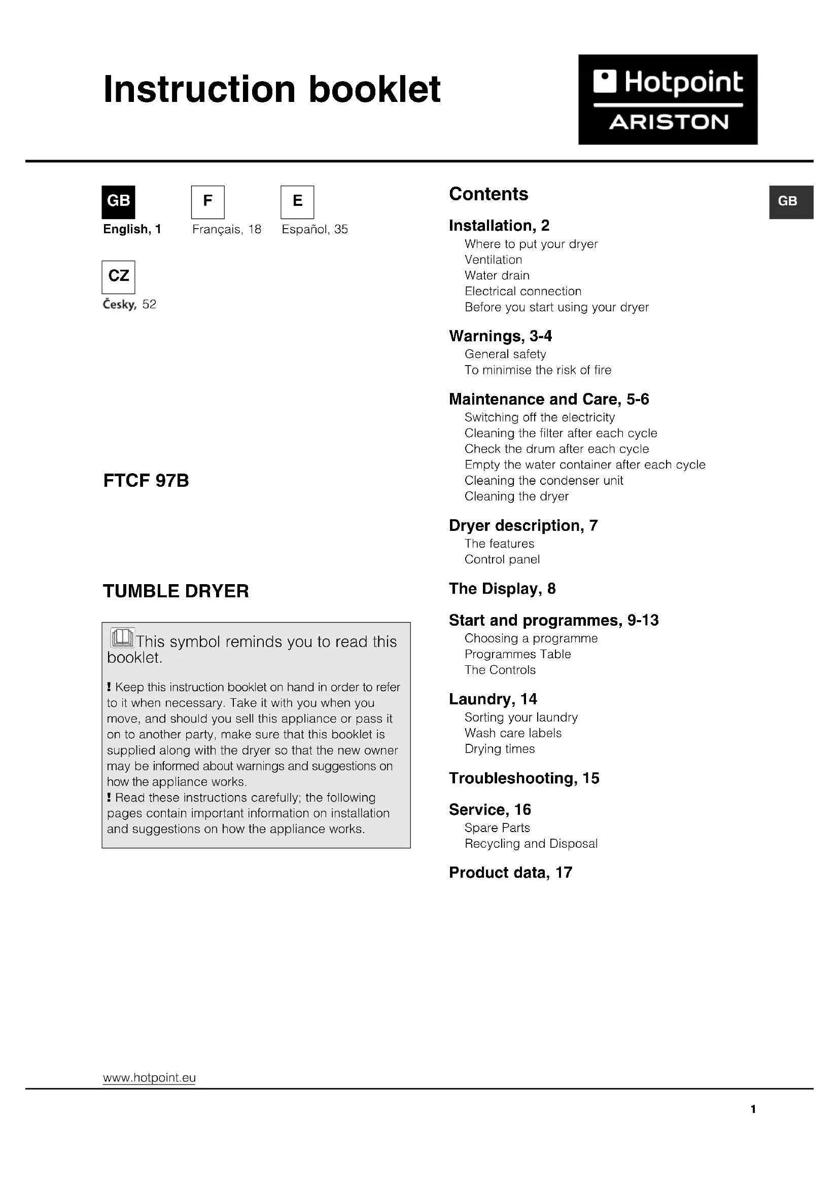 Français, 18 Contents Installation, 2 Where to put your dryer Ventilation Water drain Electrical connection Before you start using your dryer Warnings, 3-4 General safety To minimise the risk of fire Maintenance and Care, 5-6 Switching off the electricity Cleaning the filter after each cycle Check the drum after each cycle Empty the water container after each cycle Cleaning the condenser unit Cleaning the dryer Dryer description, 7 The features Control panel The Display, 8 Start and programmes, 9-13 Choosing a programme Programmes Table The Controls Laundry, 14 Sorting your laundry Wash care labels Drying times Troubleshooting, 15 Service, 16 Spare Parts Recycling and Disposal Product data, 17 This symbol reminds you to read this booklet. ! Keep this instruction booklet on hand in order to refer to it when necessary. Take it with you when you move, and should you sell this appliance or pass it on to another party, make sure that this booklet is supplied along with the dryer so that the new owner may be informed about warnings and suggestions on how the appliance works. ! Read these instructions carefully; the following pages contain important information on installation and suggestions on how the appliance works. This symbol reminds you to read this booklet. ! Keep this instruction booklet on hand in order to refer to it when necessary. Take it with you when you move, and should you sell this appliance or pass it on to another party, make sure that this booklet is supplied along with the dryer so that the new owner may be informed about warnings and suggestions on how the appliance works. ! Read these instructions carefully; the following pages contain important information on installation and suggestions on how the appliance works. www.hotpoint.eu