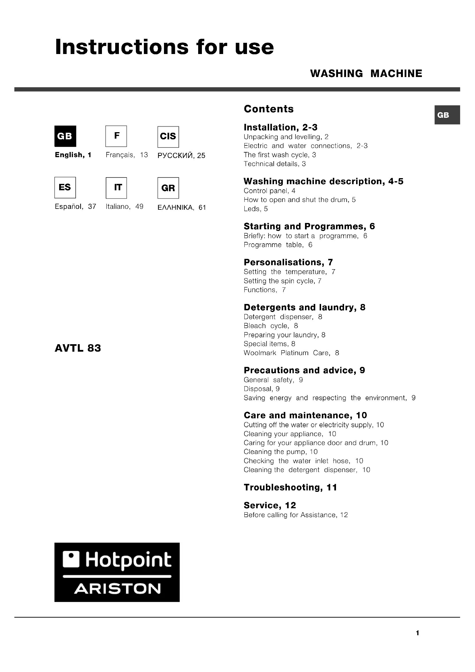 Contents Installation, 2-3 Unpacking and levelling, 2 Electric and water connections, 2-3 The first wash cycle, 3 Technical details, 3 Washing machine description, 4-5 Control panel, 4 How to open and shut the drum, 5 Leds, 5 Starting and Programmes, 6 Briefly: how to start a programme, 6 Programme table, 6 Personalisations, 7 Setting the temperature, 7 Setting the spin cycle, 7 Functions, 7 Detergents and laundry, 8 Detergent dispenser, 8 Bleach cycle, 8 Preparing your laundry, 8 Special items, 8 Woolmark Platinum Care, 8 Precautions and advice, 9 General safety, 9 Disposal, 9 Saving energy and respecting the environment, 9 Care and maintenance, 10 Cutting off the water or electricity supply, 10 Cleaning your appliance, 10 Caring for your appliance door and drum, 10 Cleaning the pump, 10 Checking the water inlet hose, 10 Cleaning the detergent dispenser, 10 Troubleshooting, 11 Service, 12 Before calling for Assistance, 12 WASHING MACHINE AVTL 83 Instructions for use English, 1