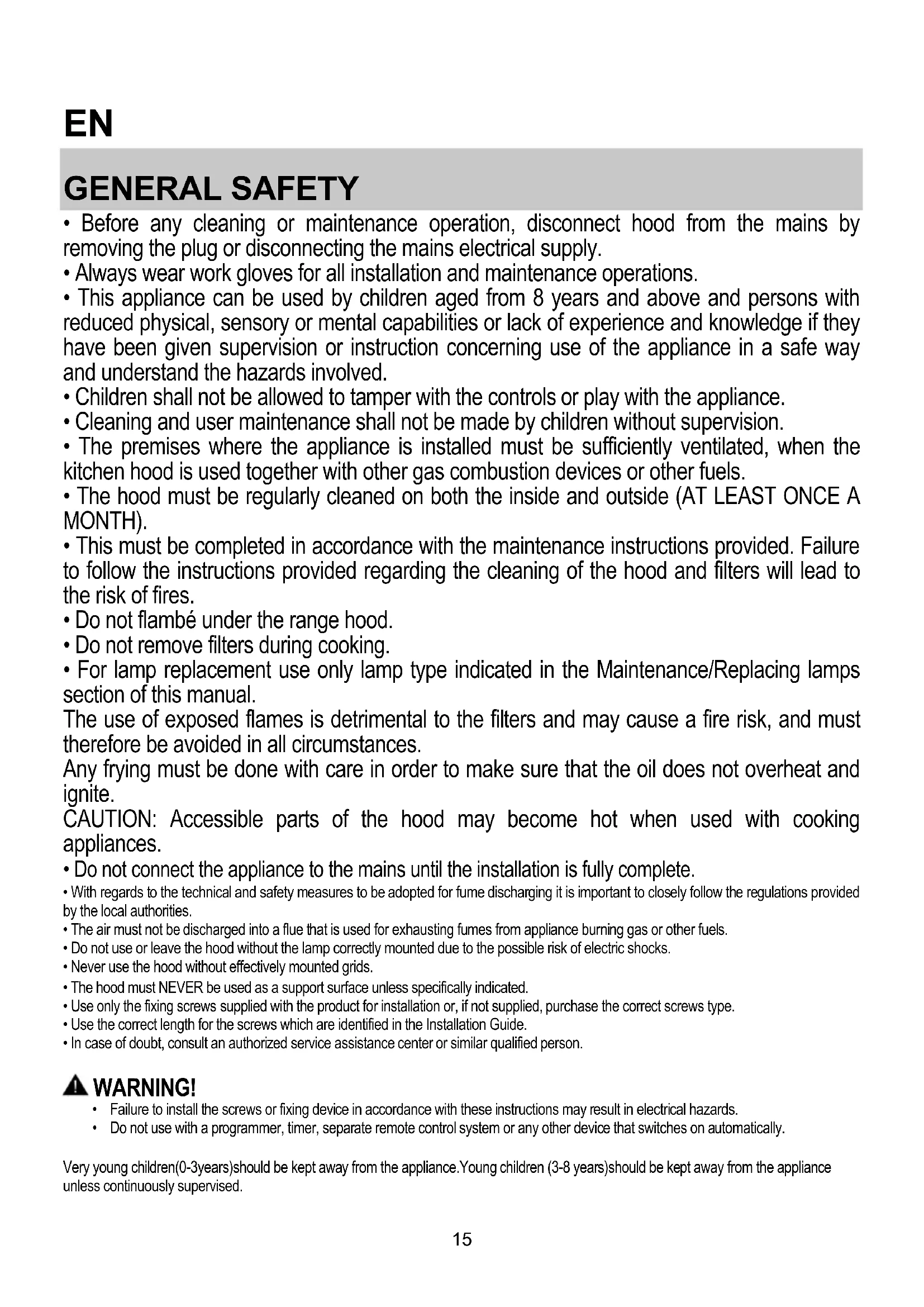- Before any cleaning or maintenance operation, disconnect hood from the mains by removing the plug or disconnecting the mains electrical supply.