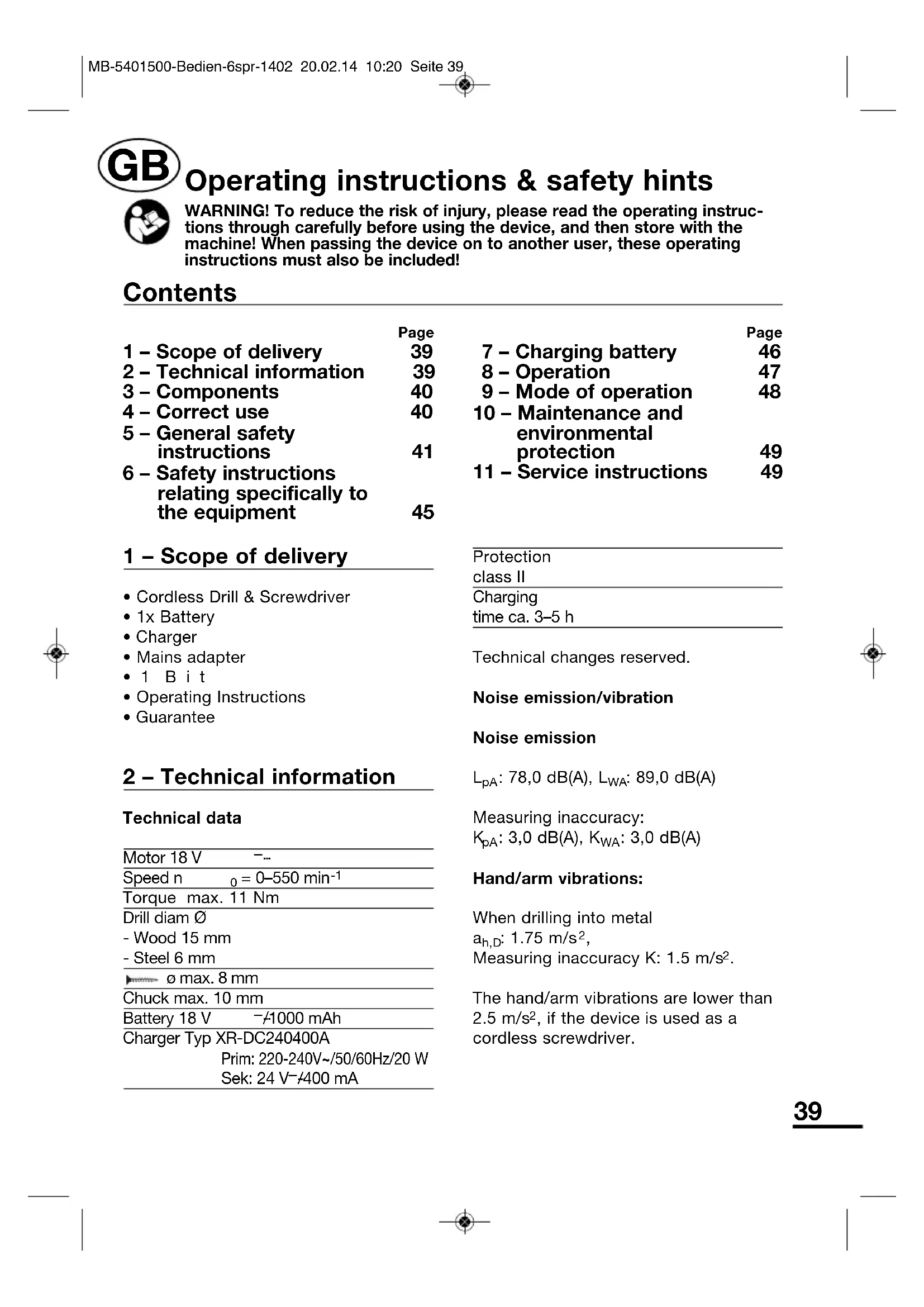 The hand/arm vibrations are lower than2.5 m/s , if the device is used as acordless screwdriver. Page 1 – Scope of delivery 39 2 – Technical information 39 3 – Components 40 4 – Correct use 40 5 – General safety instructions 41 6 – Safety instructions relating specifically to the equipment 45 Page 7 – Charging battery 46 8 – Operation 47 9 – Mode of operation 48 10 – Maintenance and environmental protection 49 11 – Service instructions 49 Contents Operating instructions & safety hints WARNING! To reduce the risk of injury, please read the operating instruc-tions through carefully before using the device, and then store with themachine! When passing the device on to another user, these operatinginstructions must also be included!