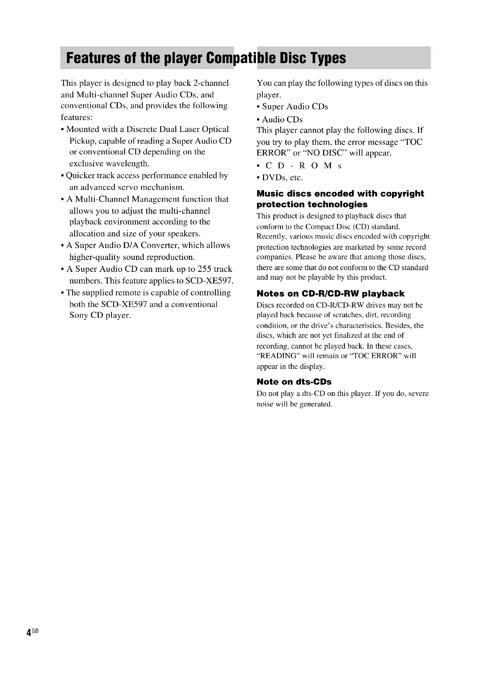 - DVDs, etc. Music discs encoded with copyright protection technologies This product is designed to playback discs that conform to the Compact Disc (CD) standard. Recently, various music discs encoded with copyright protection technologies are marketed by some record companies. Please be aware that among those discs, there are some that do not conform to the CD standard and may not be playable by this product. Notes on CD-R/CD-RW playback Discs recorded on CD-R/CD-RW drives may not be played back because of scratches, dirt, recording condition, or the drive’s characteristics. Besides, the discs, which are not yet finalized at the end of recording, cannot be played back. In these cases, “READING” will remain or “TOC ERROR” will appear in the display. Note on dts-CDs Do not play a dts-CD on this player. If you do, severe noise will be generated. Features of the player Compatible Disc Types5