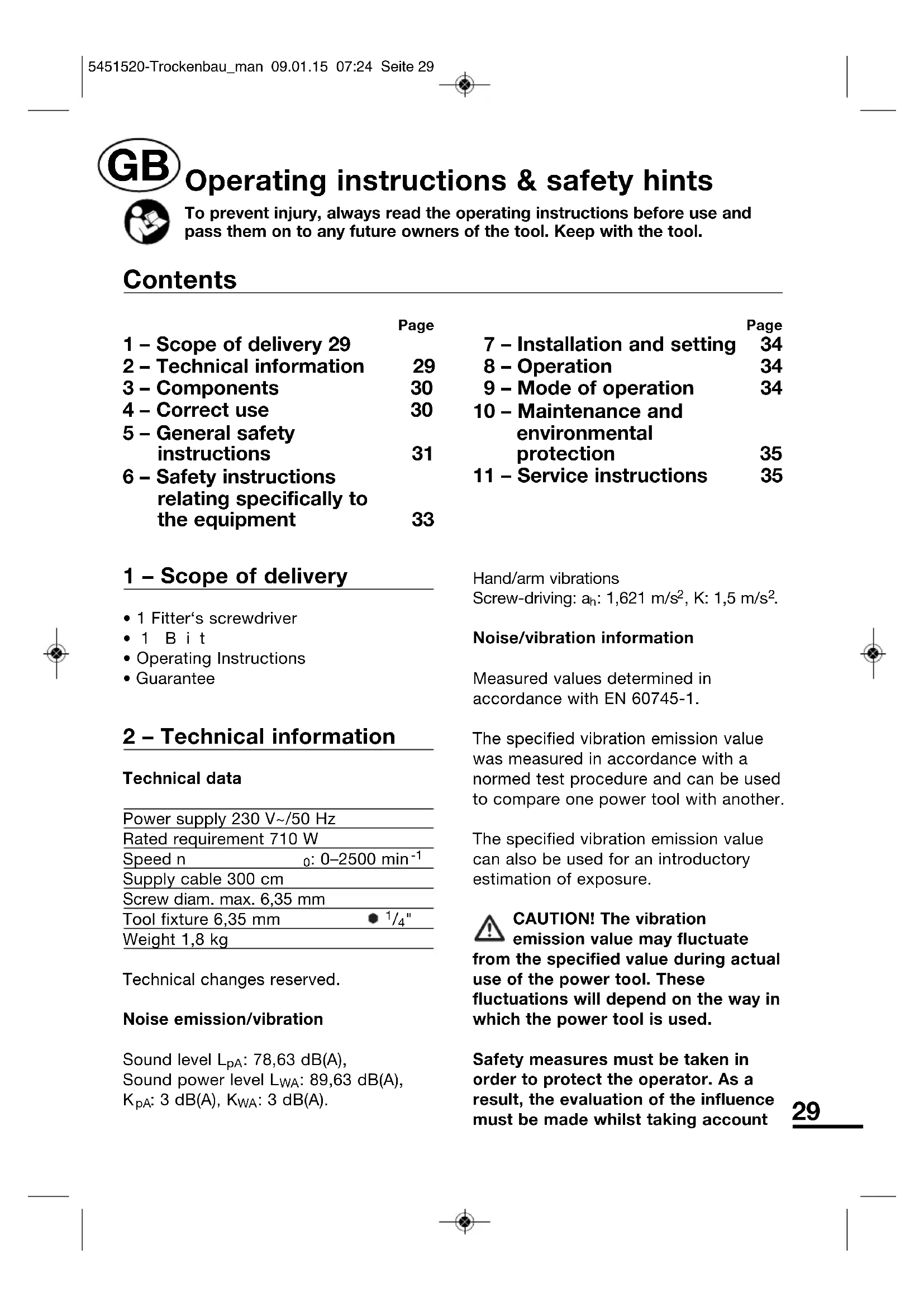 Page 1 – Scope of delivery 29 2 – Technical information 29 3 – Components 30 4 – Correct use 30 5 – General safety instructions 31 6 – Safety instructions relating specifically to the equipment 33 Page 7 – Installation and setting 34 8 – Operation 34 9 – Mode of operation 34 10 – Maintenance and environmental protection 35 11 – Service instructions 35 Contents