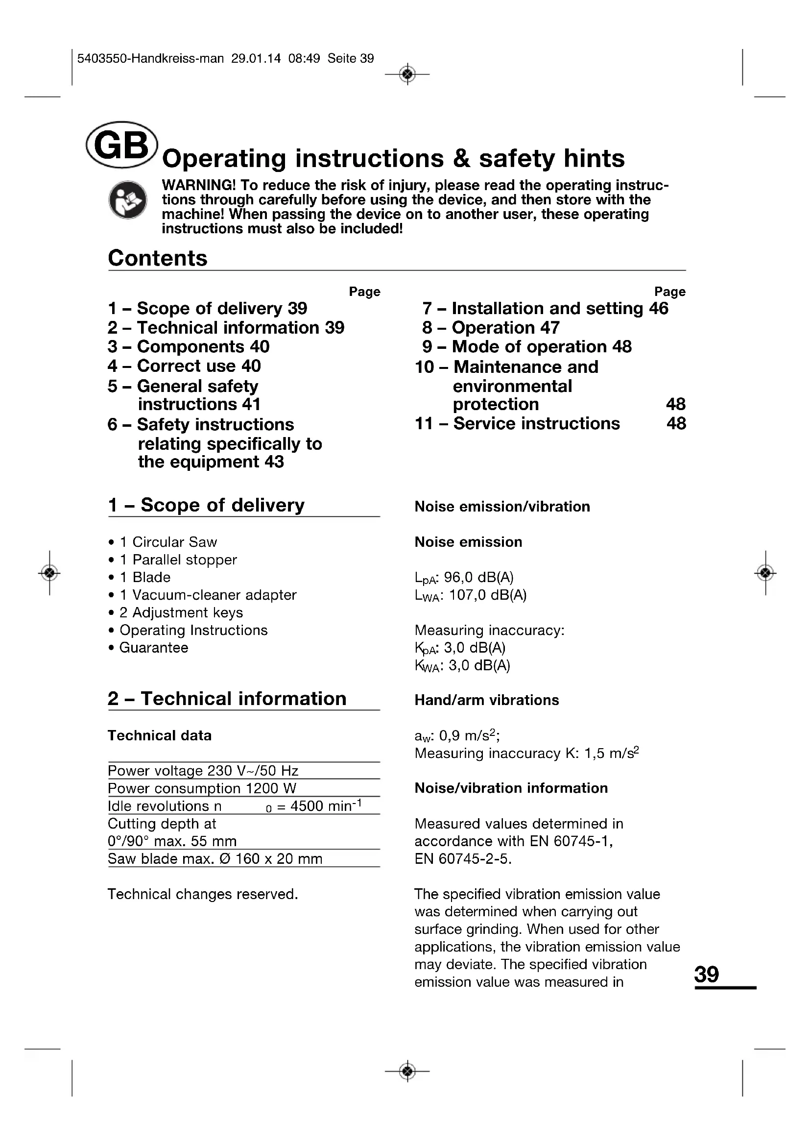 Page 1 – Scope of delivery 39 2 – Technical information 39 3 – Components 40 4 – Correct use 40 5 – General safety instructions 41 6 – Safety instructions relating specifically to the equipment 43 Page 7 – Installation and setting 46 8 – Operation 47 9 – Mode of operation 48 10 – Maintenance and environmental protection 48 11 – Service instructions 48 Contents 5403550-Handkreiss-man 29.01.14 08:49 Seite 3940 accordance with a normed test procedure and can be used in order to compare one electrical tool with another. The specified vibration emission value can also be used for an introductory evaluation of the influence. CAUTION! The vibration emission value may fluctuate from the specified value during use of the power tool. These fluctuations will depend on the way in which the power tool is used. Safety measures must be taken in order to protect the operator. As a result, the evaluation of the influence must be made whilst taking account of the actual conditions of use. (All parts of the operating cycle must be taken into account for this purpose. This also includes times in which the power tool is switched off and times in which it is switched on, but is running without load.) CAUTION! A certain amount of noise is unavoidable when using this device. Ensure you carry out noise- intensive work during permitted times. Maintain the quiet periods and limit your work to the absolute minimum. CAUTION! The effects of noise may cause damage to the hearing. Only ever work with suitable ear defenders. Anybody else in the vicinity should thus also wear ear defenders. 3 – Components 1Grip 2 Switch 3 Adjusting screws 4 Splitting wedge 5 Hinged guard 6 Hexagon screw 7 Base plate 8 Flange 9 Parallel stopper 10 Hoover connector 11 Cut angle setting 12 Cut depth setting 13 Vacuum-cleaner adapter 4 – Correct use This circular saw is strictly a hand- operated tool and the saw blade that comes with it is suited for making straight cuts in wood and wooden materials according to the specifications in this instruction manual. When used with suitable blades (adhere to manufacturer’s specifications), the tool can also be used to cut: plastics, thermo-plastics and duroplastics, laminated plastics, high-resistance foam, plaster board, rock wool boards, cemented particle board, porous concrate and nonferrous metals. All other applications are expressly ruled out. This unit may not be used by people (including children) with reduced physical, sensory or mental capacities, with a lack of experience and without the appropriate knowledge, unless they are supervised by someone who is responsible for their safety or have been instructed by such a person with regard to how the unit is to be operated. Children should be supervised to ensure that they do not play with the device. The machine is intended only for use in the household. Improper use of the product All applications carried out with the device that are not listed in the "Proper use" chapter will be considered improper use. 5403550-Handkreiss-man 29.01.14 08:49 Seite 4041 Uses for which the tool is not designed may cause risks and injury. Do not use accessories that are not intended specifically for this electrical tool. Just because you can affix an accessory to your electrical tool, there is no guarantee it is safe to use. The permitted revolutions of the tool insert must be at least as high as the highest value specified on the electrical tool. Accessories that turn faster than is permitted may break and fly off. There is a risk of injury. The user of the device is liable for all property and personal damages occurring as the result of incorrect use. If other components or non-original components are used with the machine, the manufacturer guarantee is voided. Remaining risks: The operating instructions for this electrical tool contains comprehensive tips for the safe handling of electrical tools. However, every electrical tool has a certain level of remaining risks which cannot be excluded by the protective mechanisms on the device. Only operate electrical tools always with necessary care. Remaining risks may be, for example: