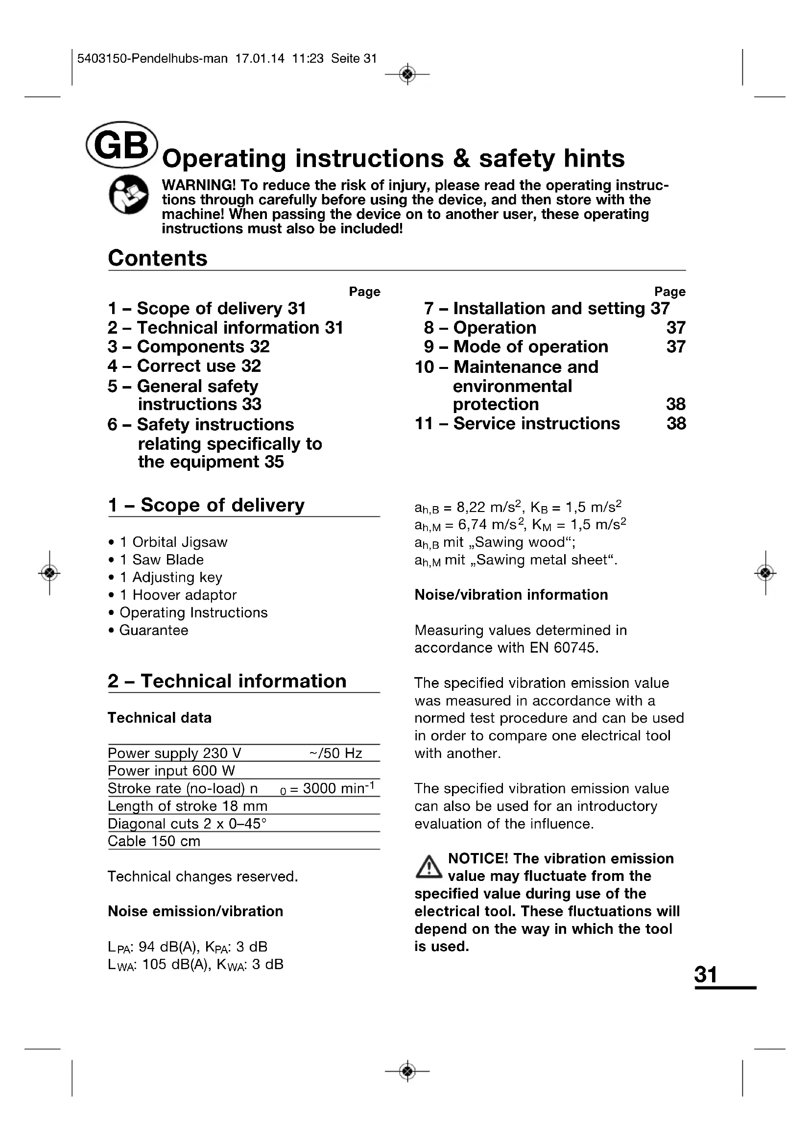 Page 1 – Scope of delivery 31 2 – Technical information 31 3 – Components 32 4 – Correct use 32 5 – General safety instructions 33 6 – Safety instructions relating specifically to the equipment 35 Page 7 – Installation and setting 37 8 – Operation 37 9 – Mode of operation 37 10 – Maintenance and environmental protection 38 11 – Service instructions 38 Contents